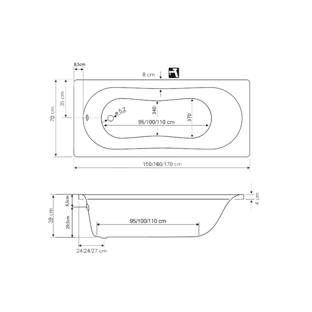 - Distanța de la fundul căzii până la marginea inferioară a orificiului de preaplin 25 cm