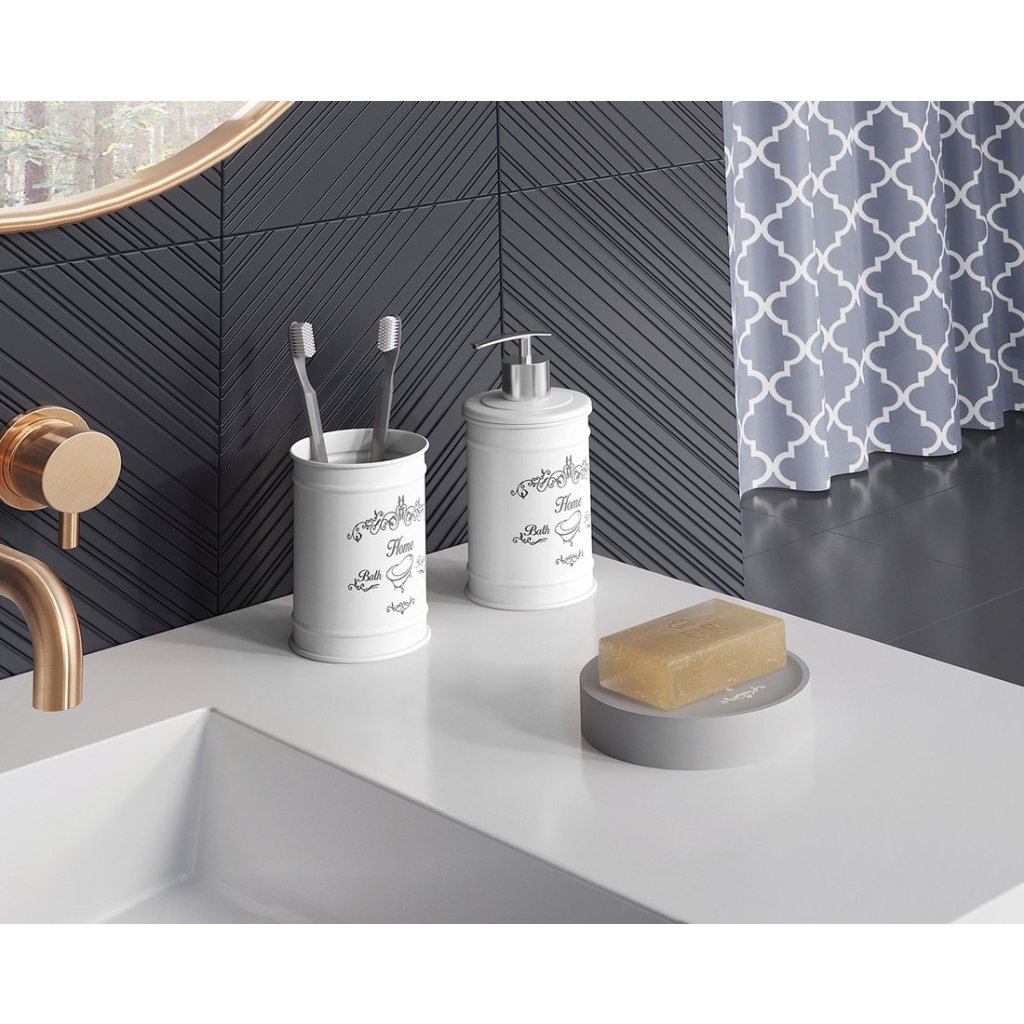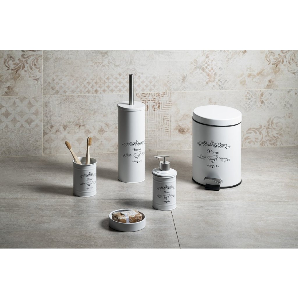 Seria de accesorii din otel inoxidabil si lacuit alb cu decor este o alegere excelenta pentru bai in stil vintage.