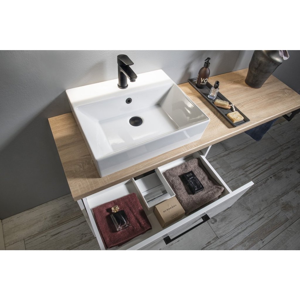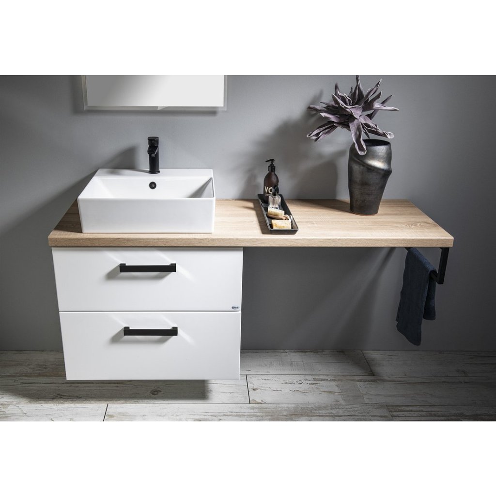 Mobilierul de baie VEGA cu blat VEGA (HPL) cu decor stejar platinat poate fi combinat cu chiuvete pe picioare.