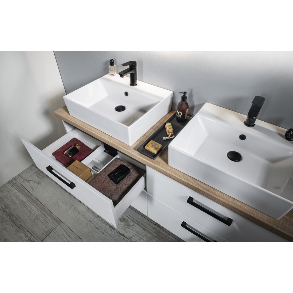 Mobilierul de baie VEGA cu blat de masă VEGA (HPL) cu decor stejar platină poate fi combinat cu chiuvete pe picioare.