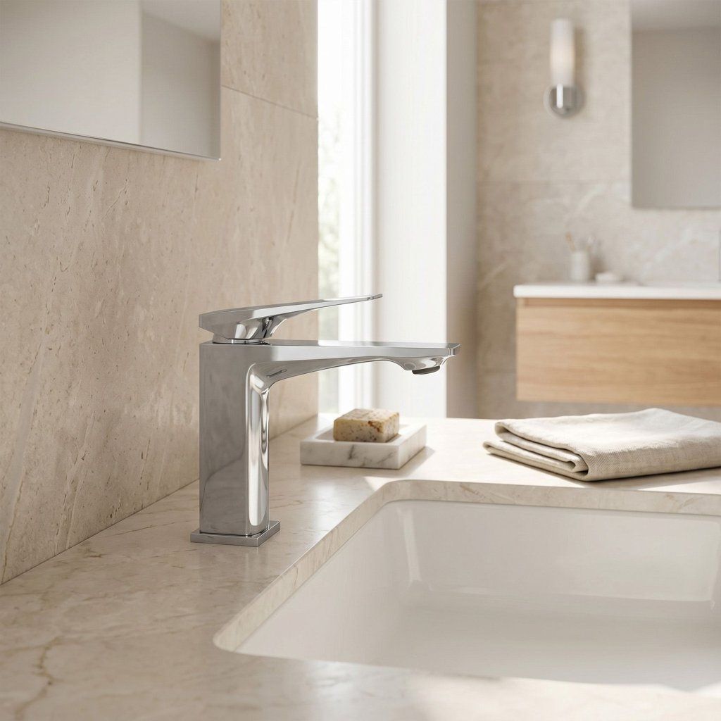 Prime Chrome Low este cea mai accesibilă baterie din seria Prime REA — aceeași construcție din alamă, același cartuș ceramic, același design geometric ca și versiunea High, într-un format compact pentru chiuvete încastrate. O garanție de cinci ani confirmă că prețul nu a însemnat un compromis în ceea ce privește calitatea.