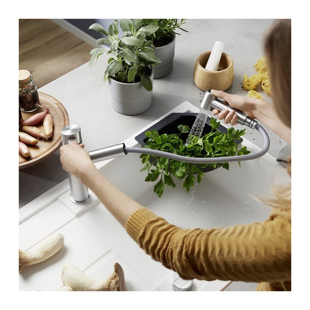 Un material compozit care este format din până la 80% granit. Chiuvetele realizate din acest material impresionează prin caracterul lor de piatră, plăcut la atingere și proprietăți de neegalat. Sunt dure, ferme și ușor poroase. Materialul reprezintă un echilibru perfect între îngrijire ușoară și durabilitate, suprafață netedă și culori care pot fi combinate ideal cu mediul bucătăriei.