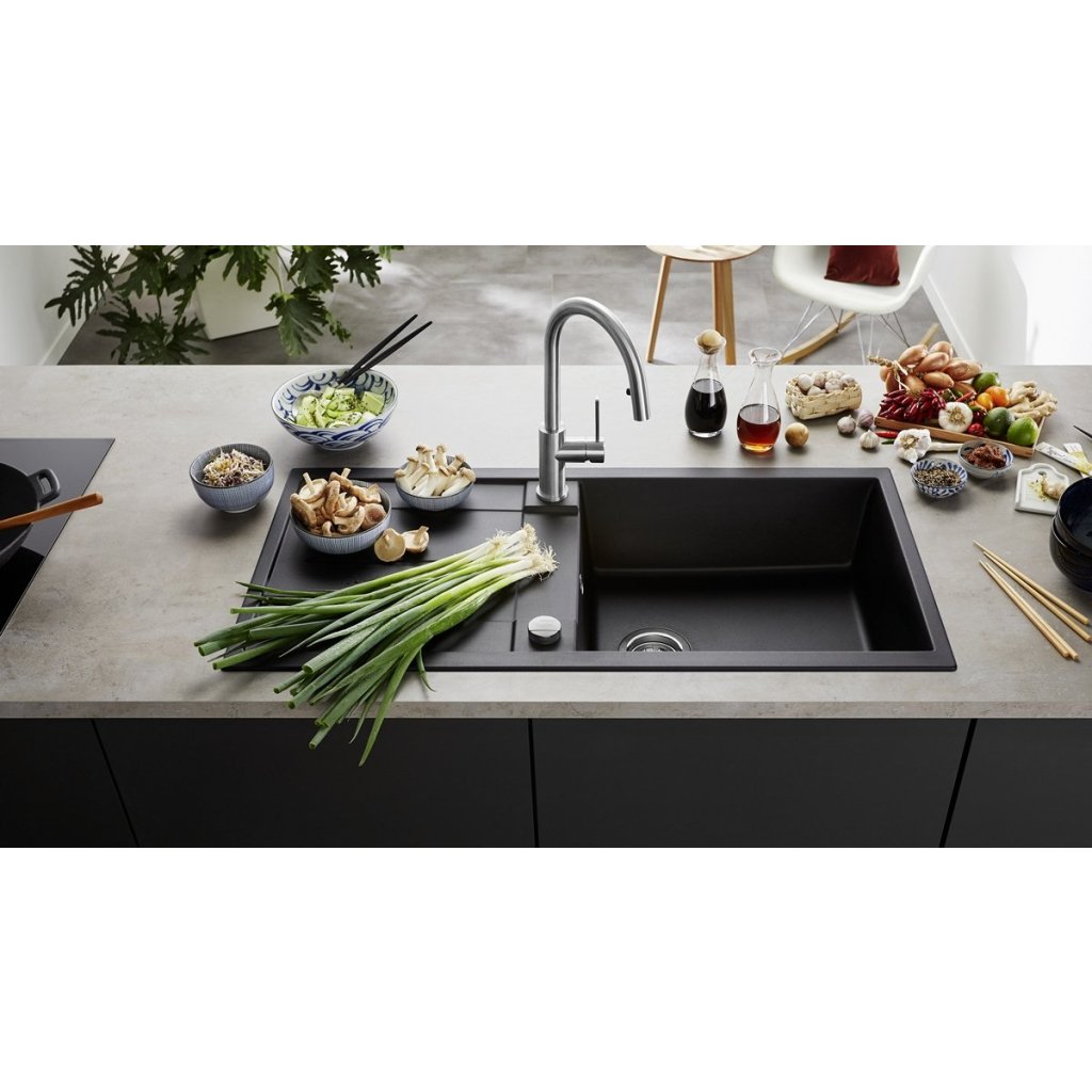 METRA XL 6 S produs de Blanco este o chiuvetă cu o singură cameră cu dimensiuni de 1000 x 500 mm. Tava de chiuveta cu dimensiunile de 490 x 430 mm are o adancime de 190 mm si are o suprafata practica de scurgere pentru o utilizare mai eficienta a chiuvetei. Chiuveta este destinată instalării pe un blat cu o lățime minimă a dulapului de 500 mm. Puteți alege dintr-o gamă largă de culori. O chiuvetă din granit este foarte ușor de întreținut. De asemenea, rezistă la zgârieturi și alte eventuale daune din utilizarea normală. Este stabilă în culoare și, de asemenea, rezistă la temperaturi ridicate. Unul dintre avantajele chiuvetei este porozitatea redusă și elementele antibacteriene, datorită cărora chiuveta devine o opțiune igienică pentru gospodăria ta.