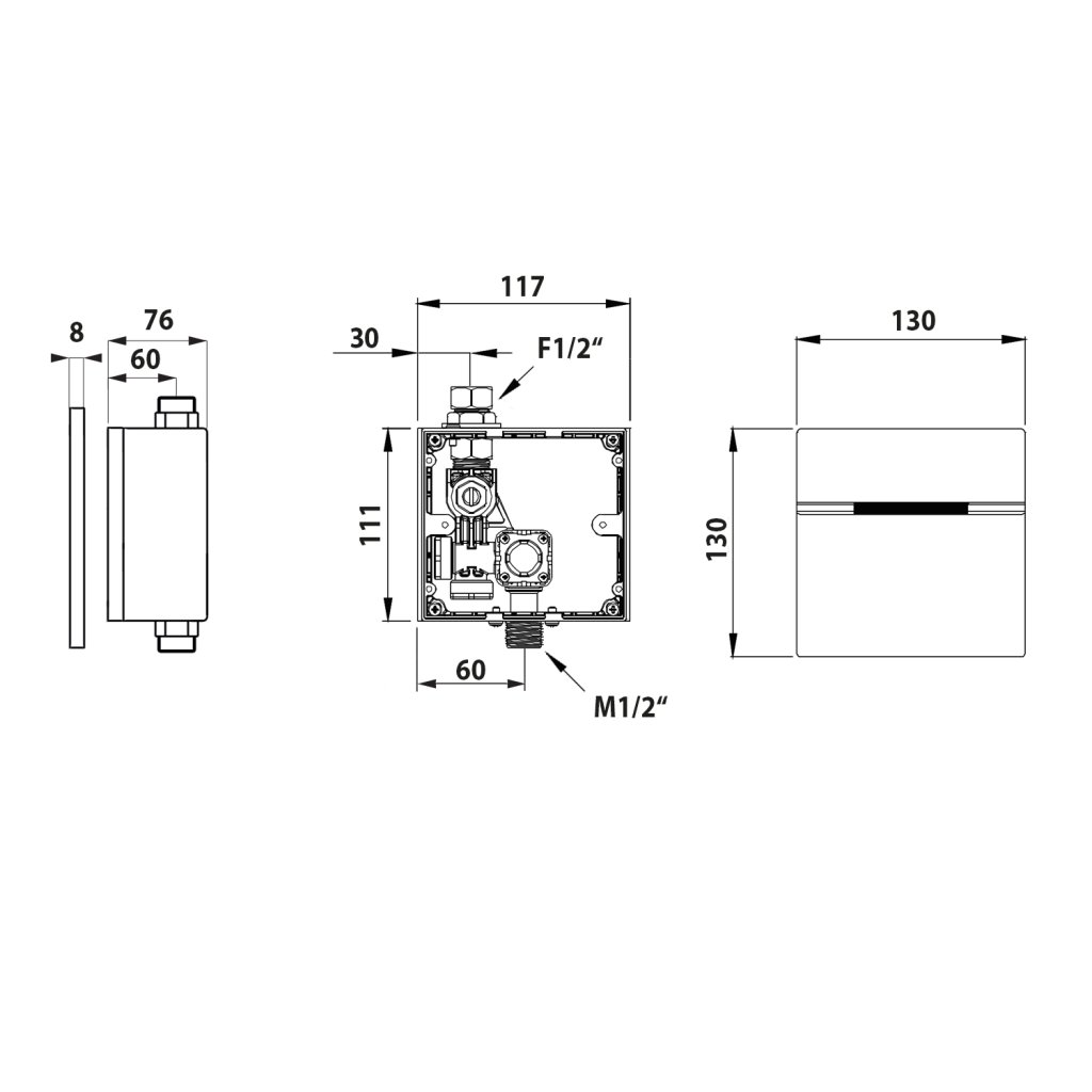 Reacționează la prezența unei persoane în fața pisoarului la o distanță de 35-65 cm de senzor. Mai întâi are loc o clătire (2s) și apoi după părăsirea zonei detectate, o clătire (3-4s)
