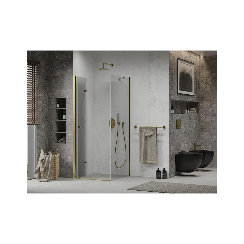 O alegere excelentă pentru orice baie. Cabina de dus eleganta este realizata din sticla securizata cu grosimea de 6 mm intr-un design clar. Tratamentul de suprafață aplicat sticlei asigură confort maxim tuturor utilizatorilor. Această tehnologie garantează proprietăți unice care împiedică murdărirea sticlei - suprafața trebuie doar clătită cu apă. Coltarul este fixat in profile de aluminiu auriu si este prevazut cu o garnitura care impiedica scurgerea apei in afara dusului. Ușa dușului este pliabilă (două geamuri de sticlă conectate prin balamale de înaltă calitate care pot fi pliate spre interior și spre exterior). Pentru deschidere se folosește un mâner metalic discret.