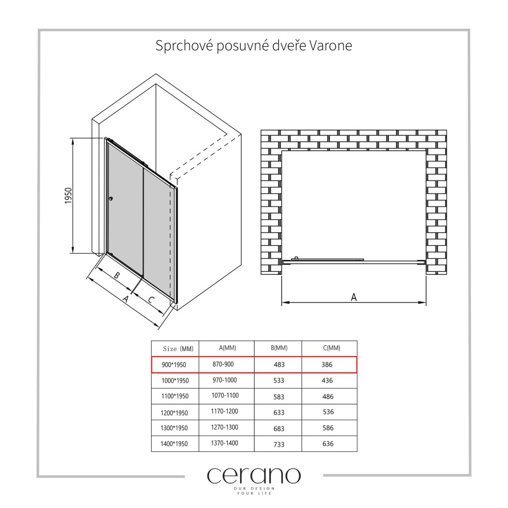 Cerano Varone, usa culisanta de dus 90x195 cm, sticla transparenta 6mm, profil cromat, CER-CER-DY505-90-195