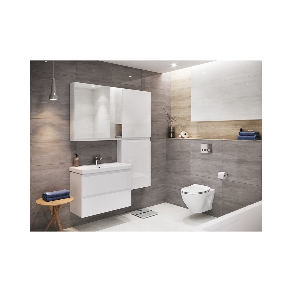 Dulap de perete MODUO cu chiuveta este un exemplu de mobilier modern de baie. Părțile frontale ale sertarelor cu mânere ascunse și corpul dulapului sunt acoperite cu lac alb lucios, chiuveta are preaplin și deschidere pentru robinet. Sertarele sunt dotate cu sistem de inchidere silentioasa.