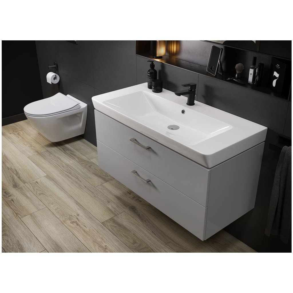 Un dulap suspendat in design lucios cu doua sertare cu sistem de inchidere moale, completat cu manere cromate, prevazut cu chiuveta ceramica.