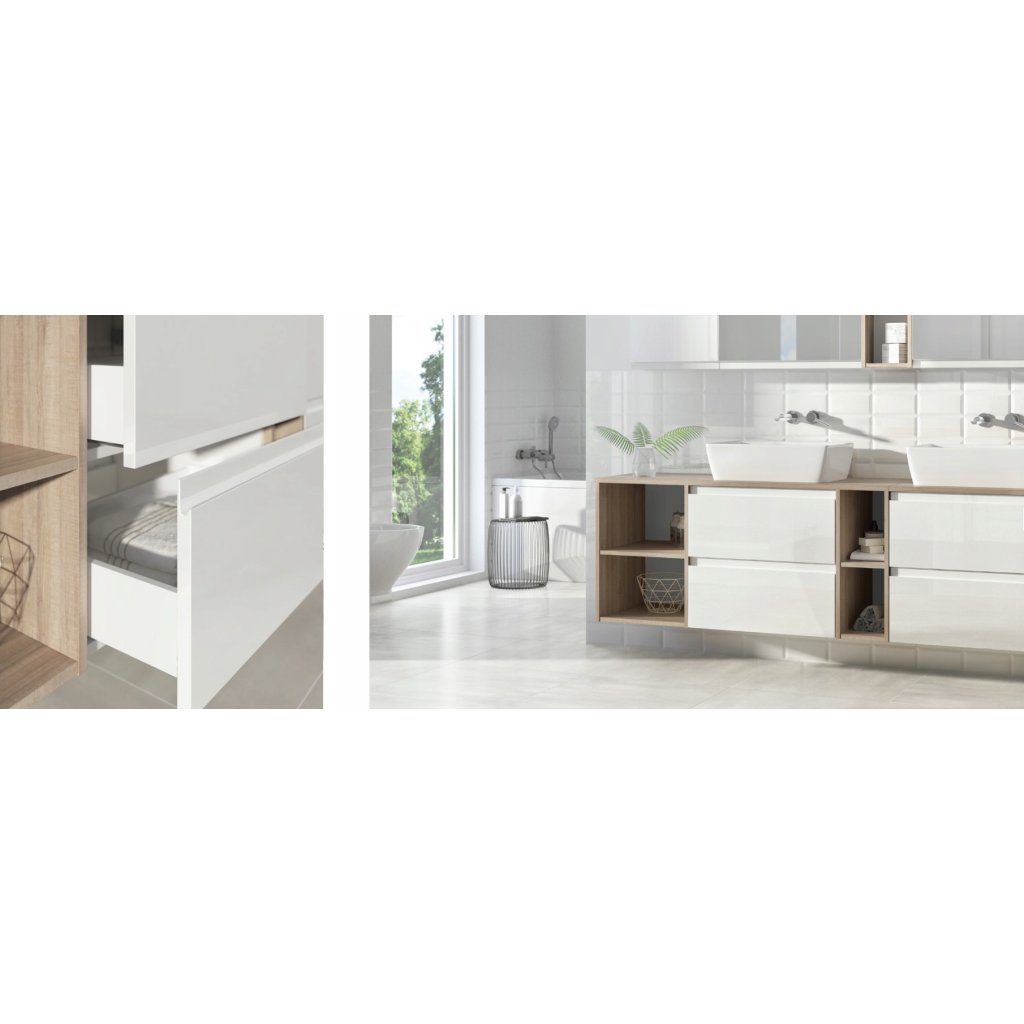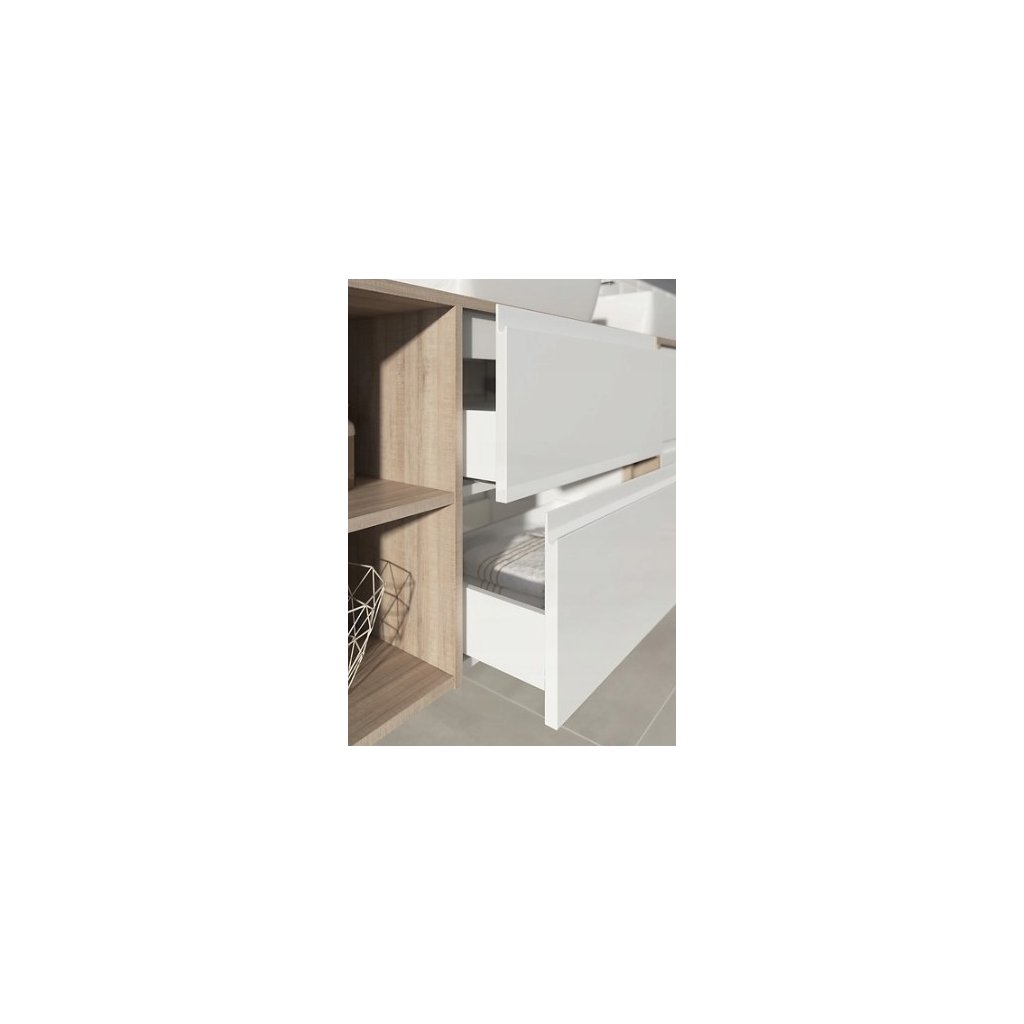 Dulapul pentru lavoar MODUO SLIM cu o linie stilistica moderna este realizat din tabla de mobilier lacuita in culoarea alba. Modelul este echipat cu manere frezate confortabile si sistem de inchidere silentioasa. Interiorul sertarelor este finisat într-o nuanță caldă de gri. Datorită adâncimii reduse, poate fi instalat chiar și în încăperi înguste. Acest lucru vă permite să adaptați interiorul la nevoile dumneavoastră individuale. Dulapul este adaptat pentru instalare cu chiuveta de mobilier MODUO SLIM 60.