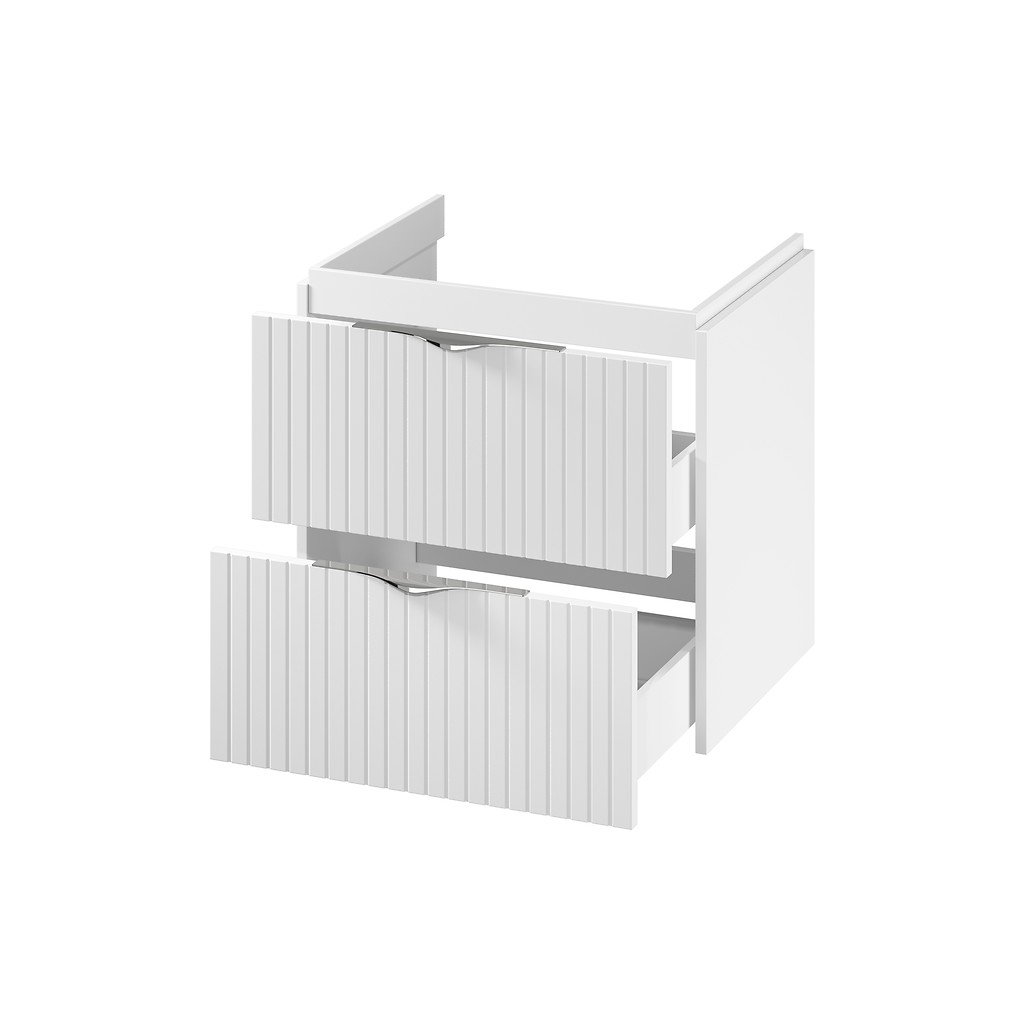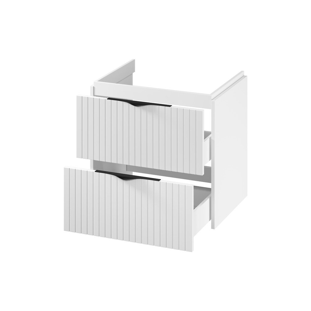 Dulapul este dotat cu două sertare spațioase cu fund plin, care oferă mai mult spațiu de depozitare pentru diverse accesorii de baie - motiv pentru care recomandăm utilizarea unui sifon care economisește spațiu. Mecanismul de închidere silențioasă asigură o închidere lină și silențioasă, ceea ce sporește confortul în utilizare. Partea frontală a dulapului este realizată din placă MDF canelată cu finisaj mat, ceea ce îi conferă o textură moale și un aspect elegant. Corpul dulapului este din PAL laminat, de asemenea, cu finisaj mat. Produsul se potrivește perfect cu lavoarele de mobilier, încorporate în blatul de lucru, precum și cu lavoarele de blat, astfel încât poate fi adaptat cu ușurință la diferite amenajări de baie. În plus, kitul include două seturi de mânere metalice (negru și cromat), permițându-vă să personalizați aspectul dulapului în funcție de preferințele utilizatorului. Dulapul este conceput pentru auto-asamblare, permițând personalizarea și personalizarea ușoară.