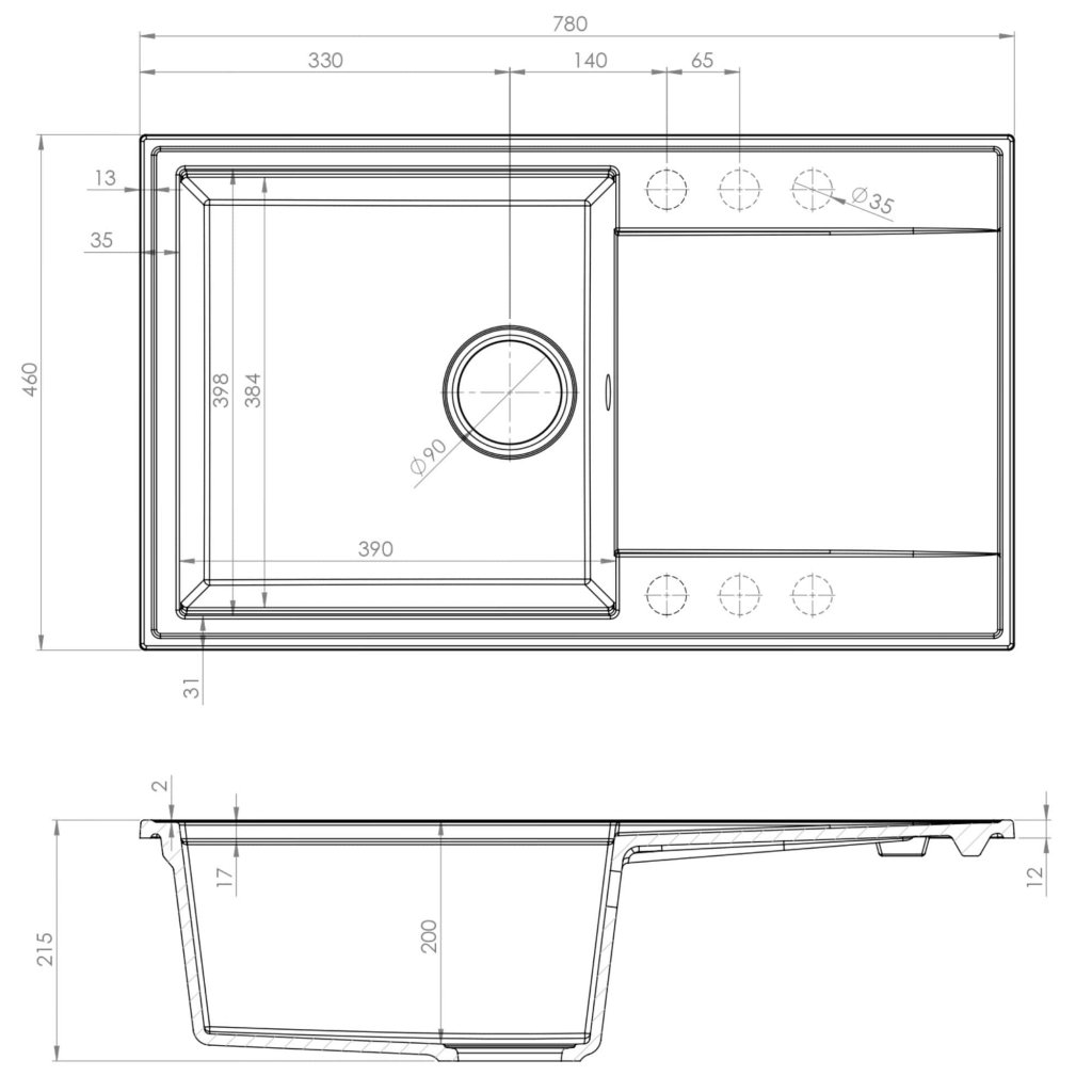 Chiuveta de bucătărie are 2 orificii tăiate din fabrică pentru robinet și dozatorul de detergent. Dacă nu intenționați să instalați un dozator de detergent, orificiul poate fi ușor acoperit cu capacul inclus, care face parte din produs. În plus, produsul are un orificiu pentru sifon (diametru 90 mm) și un orificiu de preaplin. Acest lucru face instalarea rapidă și nu necesită echipament profesional.