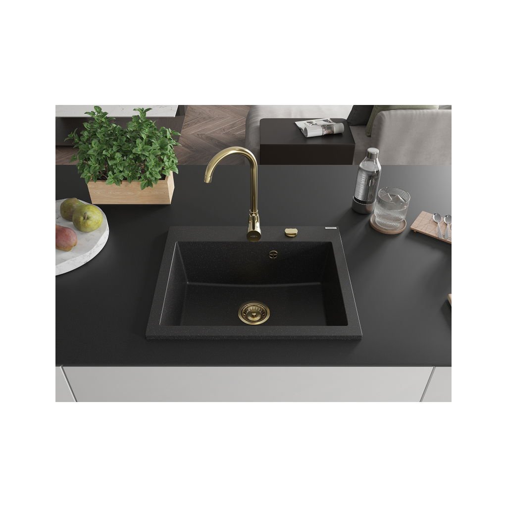 Chiuvetă Mexen Elix din granit cu 1 compartiment, 600 x 500 mm, negru/argintiu metalic, sifon auriu - 6525601005-73-G