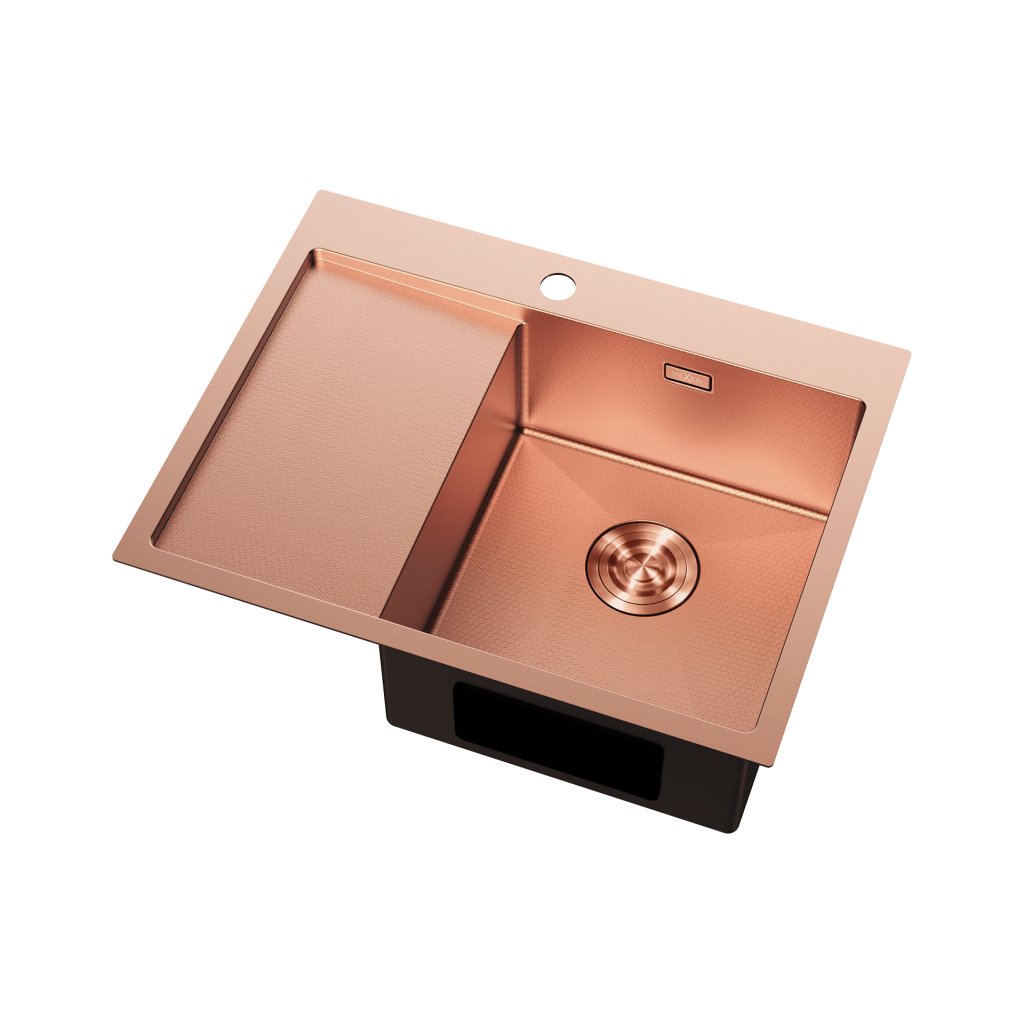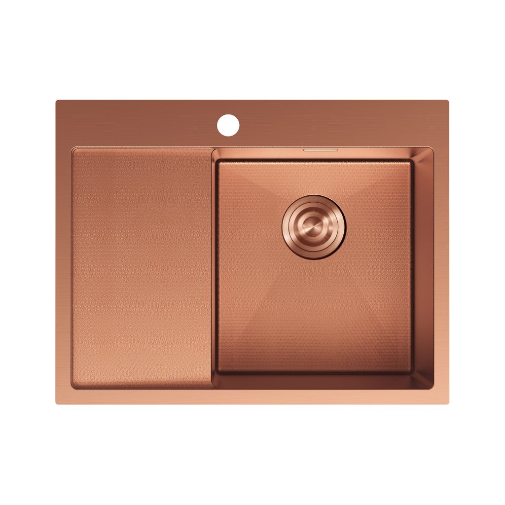 Chiuvetă Mexen Exar, din oțel inoxidabil cu 1 cuvă și scurgător, dreapta, 620 x 480 mm, cupru periat, model fagure, 6432621005P-65HC