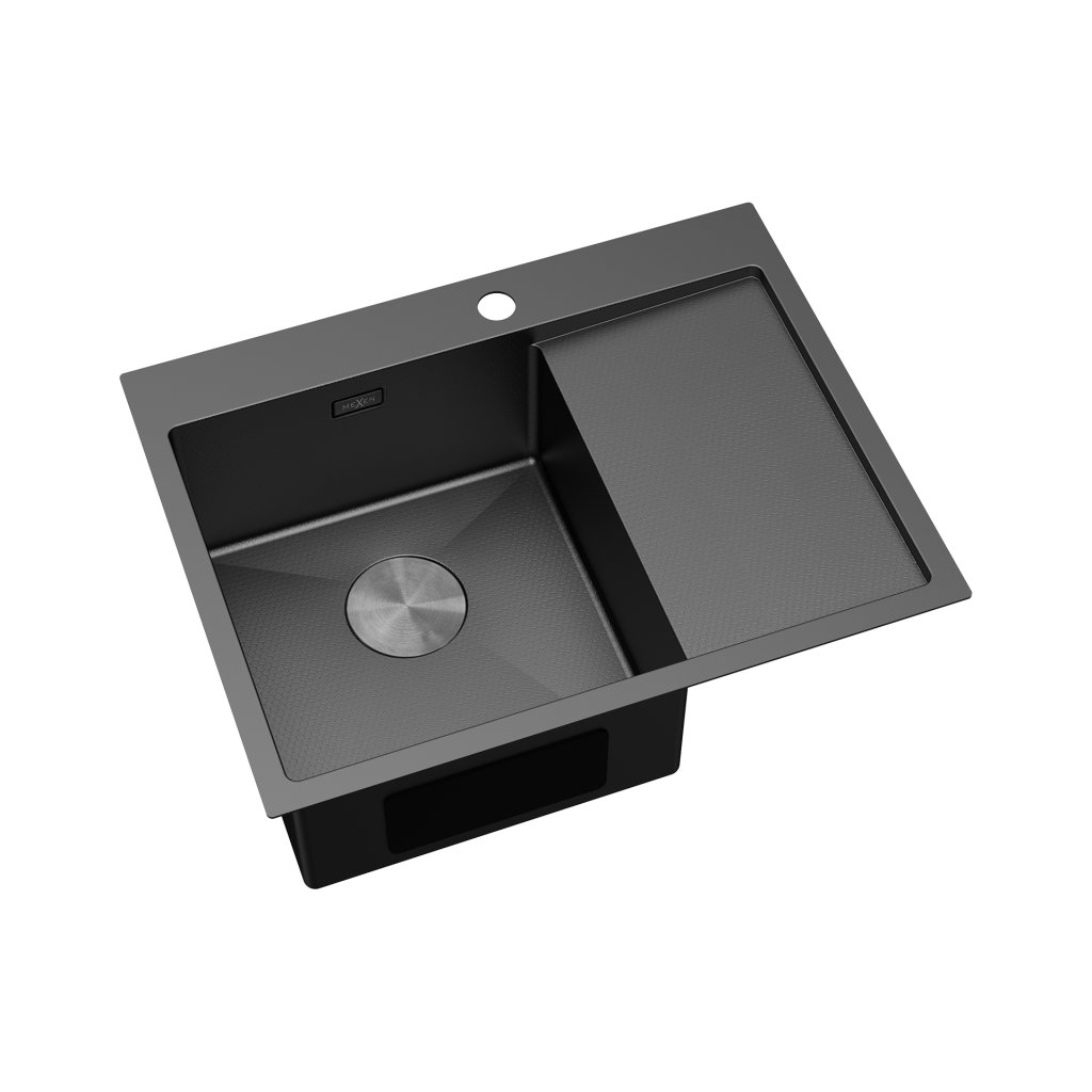 Chiuvetă Mexen Exar, din oțel inoxidabil cu 1 cuvă și scurgător, stânga, 620 x 480 mm, neagră, model fagure, 6431621005L-70HC