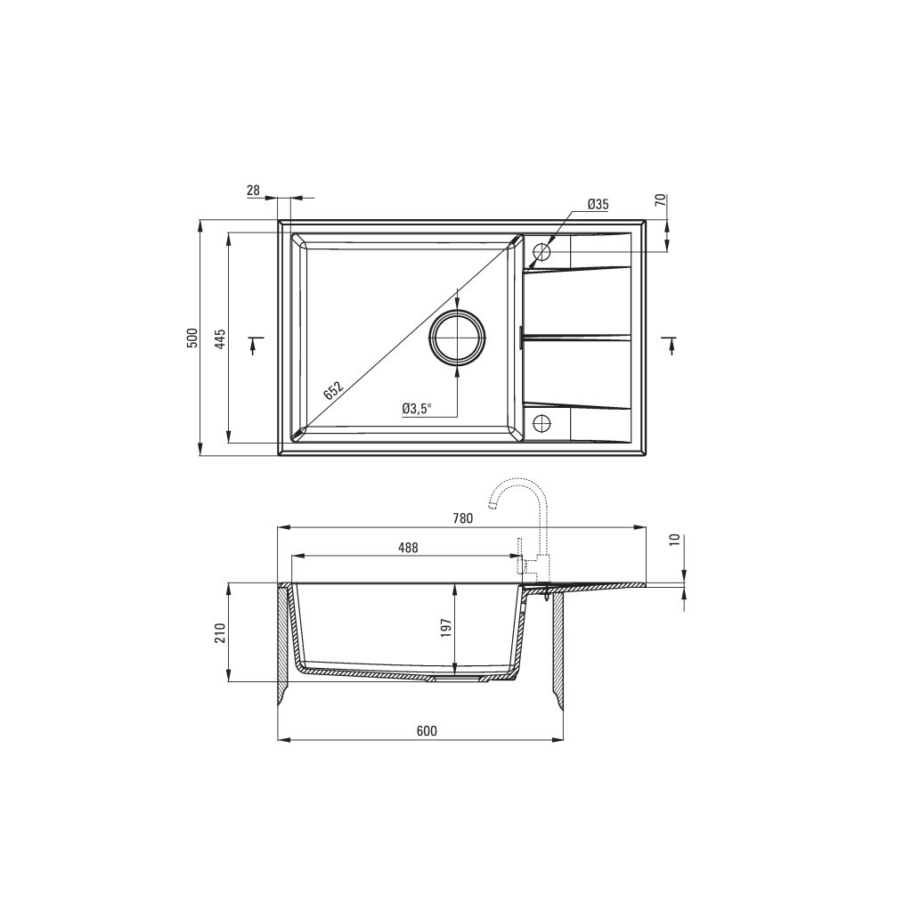 Deante Eridan, chiuvetă blat granit 780x500x210 mm Z/O, 3,5" + sifon care economisește spațiu, 1 cameră, grafit metalic, ZQE_G11B