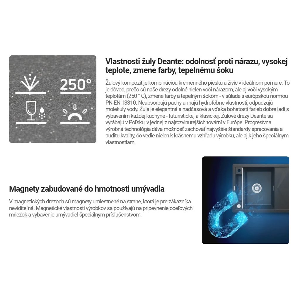 Compozitul de granit este o combinație de nisip de cuarț și rășini într-un raport ideal. Acesta este motivul pentru care chiuvetele noastre sunt rezistente nu numai la impact, ci și la temperaturi ridicate (250 ° C), decolorare și șoc termic - în conformitate cu standardul european PN-EN 13310. Nu absorb mirosurile și au proprietăți hidrofobe, resping molecule de apă. Granitul este elegant și atemporal și, datorită bogăției culorilor sale, se potrivește bine cu echipamentele oricărei bucătării - futuriste și clasice. Chiuvetele din granit Deante sunt fabricate in Polonia, intr-una dintre cele mai dezvoltate fabrici din Europa. Tehnologia de producție progresivă face posibilă menținerea celor mai înalte standarde de procesare și audit de calitate, ceea ce duce nu numai la aspectul frumos al produsului, ci și la proprietățile sale speciale.