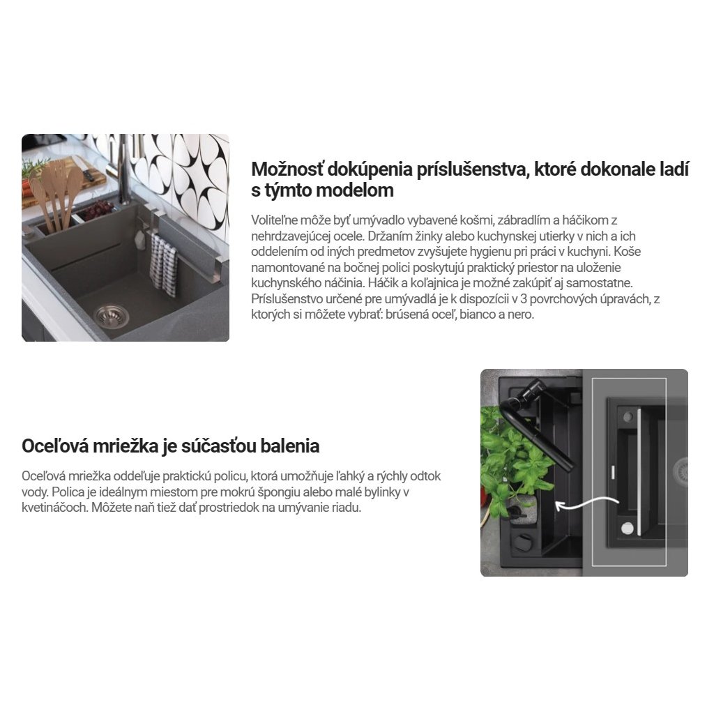 O grilă de oțel separă un raft practic care permite scurgerea ușoară și rapidă a apei. Raftul este un loc ideal pentru un burete umed sau ierburi mici în ghivece. Puteți pune și lichid de spălat vase pe el.