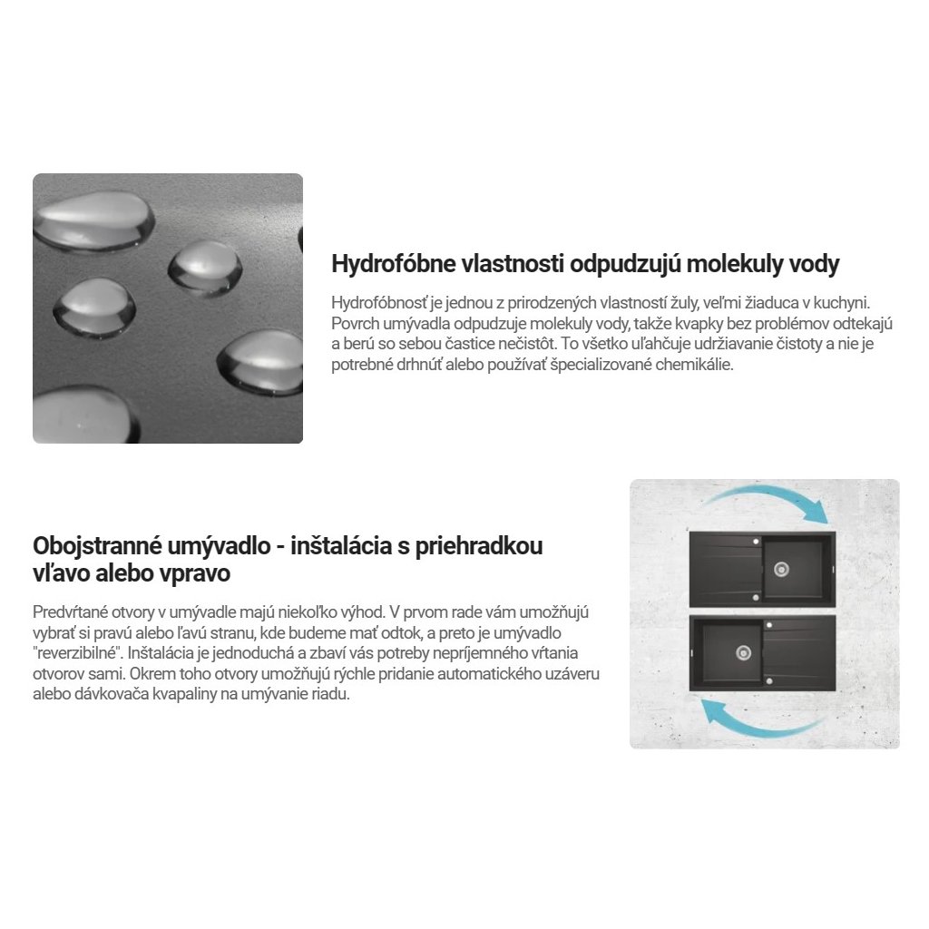 Hidrofobia este una dintre proprietățile naturale ale granitului, foarte de dorit în bucătărie. Suprafața chiuvetei respinge moleculele de apă, astfel încât picăturile curg fără probleme, luând cu ele particulele de murdărie. Toate acestea fac ca este ușor de păstrat curat și nu este nevoie să spălați sau să folosiți substanțe chimice specializate.