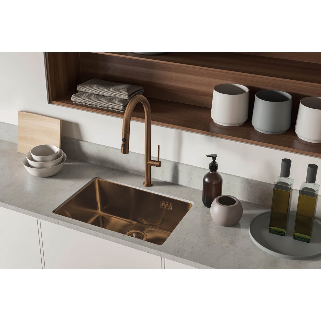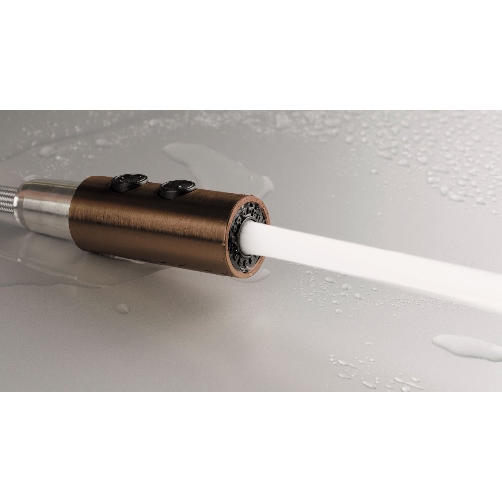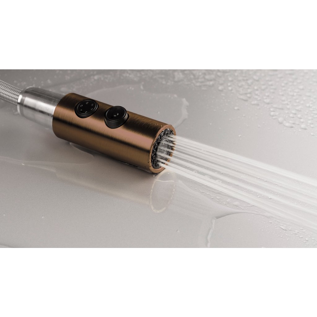 Bateria de bucătărie Olfato combină stilul și funcționalitatea și se potrivește perfect nevoilor unei bucătării moderne. Gura sa extractibilă facilitează menținerea chiuvetei curate. Telecomanda cu dublă funcție, cu jet aerat și de ploaie, oferă flexibilitate pentru sarcinile zilnice, cum ar fi spălarea vaselor sau clătirea legumelor și fructelor. Finisajul maro periat adaugă căldură și eleganță camerei.
