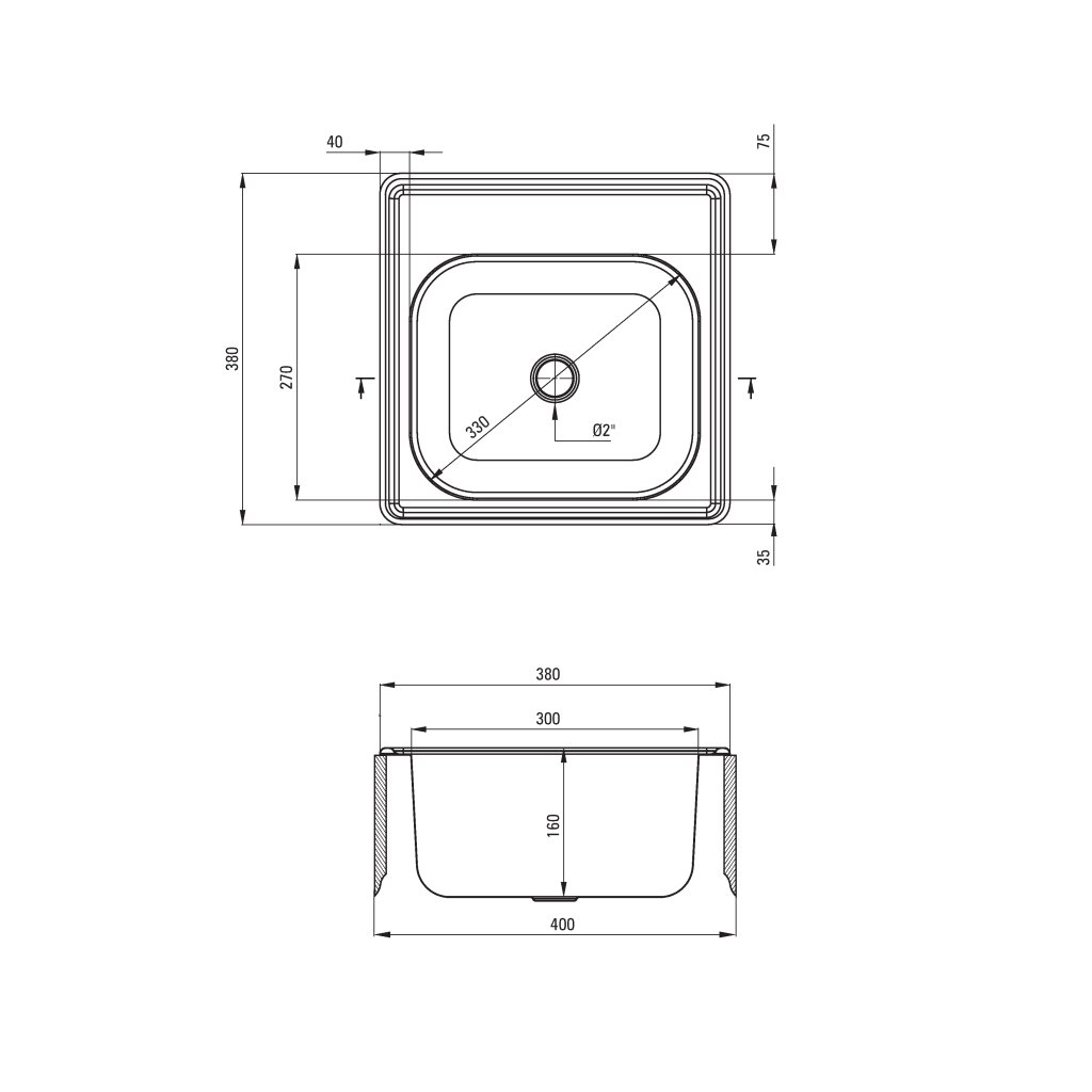 Deante Techno, chiuveta blat din otel inoxidabil cu 1 camera B/O 380x380x160 2" + sifon, model satinat, ZMU_0100