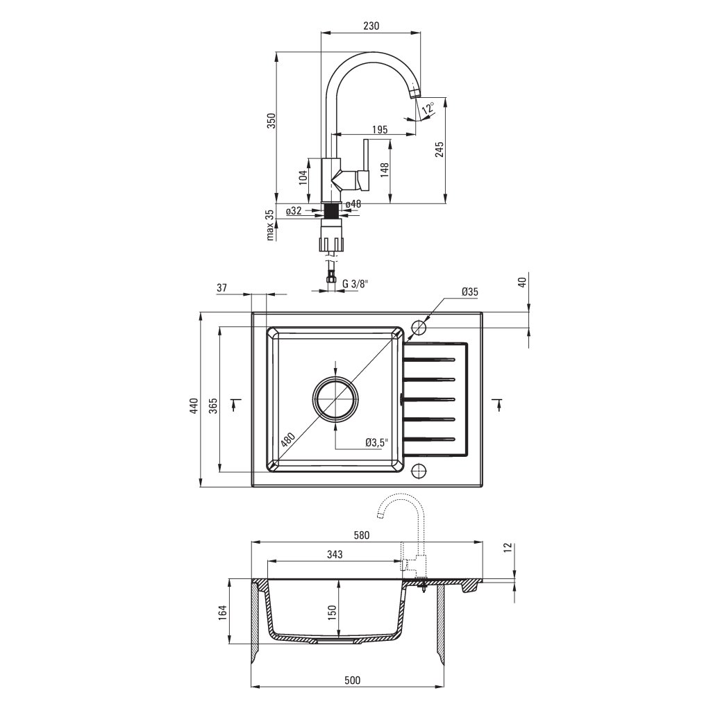 Deante Zorba, chiuveta granit 580x440x164 mm Z/KO, 3.5" + sifon cu economie de spatiu, 1 camera + robinet Milin, negru, ZQZAN11A