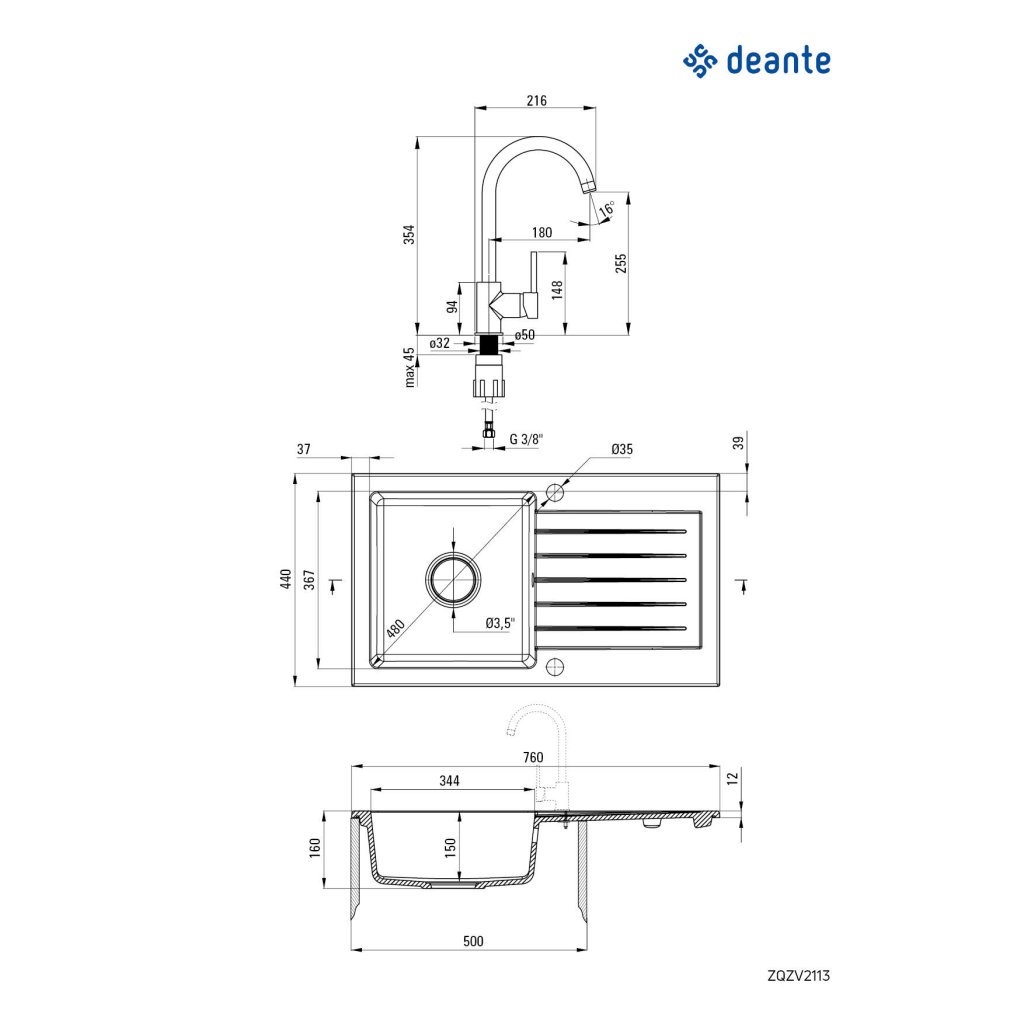 Deante Zorba, chiuveta granit 760x440x160 mm Z/O, 3.5" + sifon de economisire a spatiului, 1 camera + robinet Nemezja, nisip, ZQZV7113