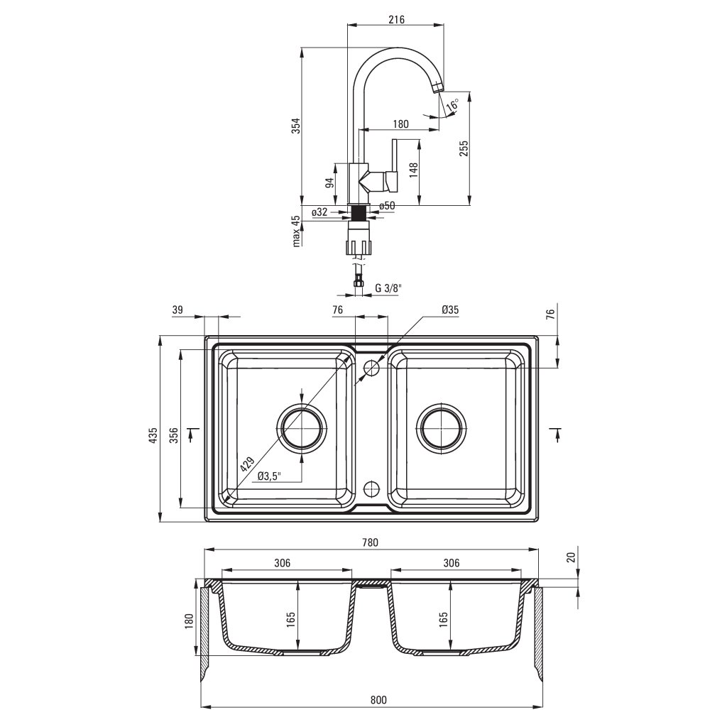 Deante Zorba, chiuveta granit 780x435x180 mm B/O + sifon de economisire a spațiului, 2 camere + robinet Nemezja, grafit, ZQZA2203