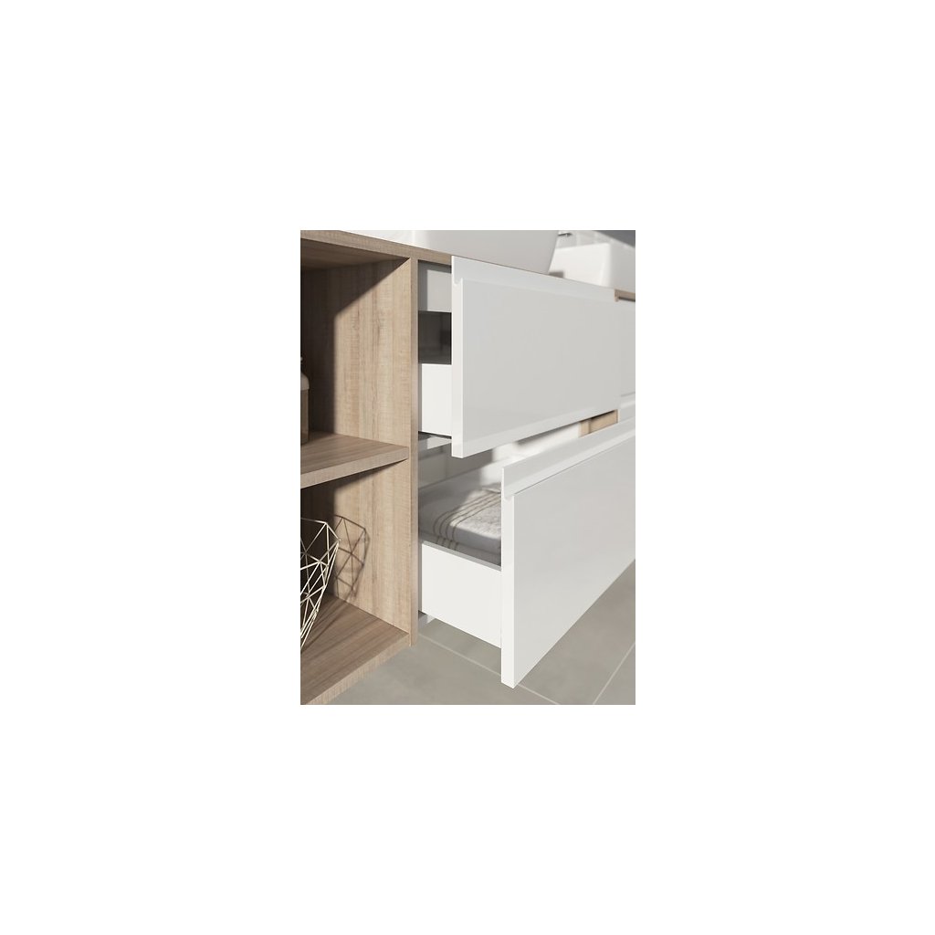 Colecția MODUO SLIM are o adâncime mai mică decât un set de lavoar standard și este un exemplu de mobilier de baie modern. Părțile frontale ale sertarelor cu mânere ascunse și corpul dulapului sunt acoperite cu lac alb lucios, chiuveta are preaplin și deschidere pentru robinet. Sertarele sunt dotate cu sistem de inchidere silentioasa.