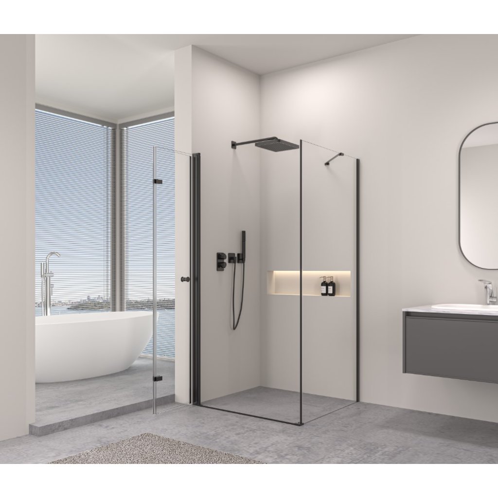 Erga Berlin, cabină de duș cu ușă rabatabilă 75 (uşă) x 110 (perete) x 195 cm, sticlă transparentă de 6 mm, profil negru, ERG-V02-BERLIN-D075G110-CL-BK