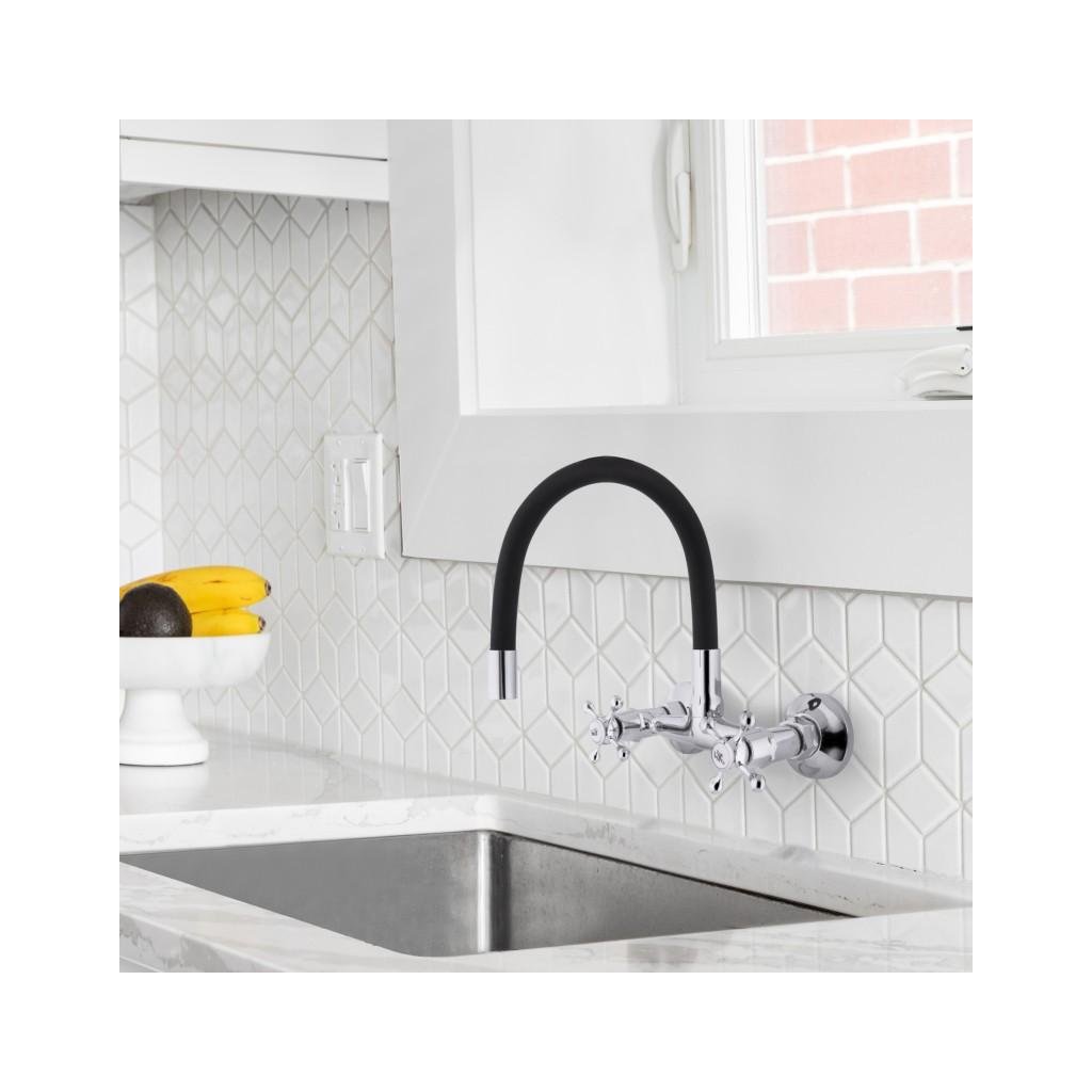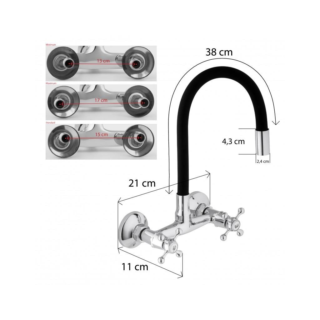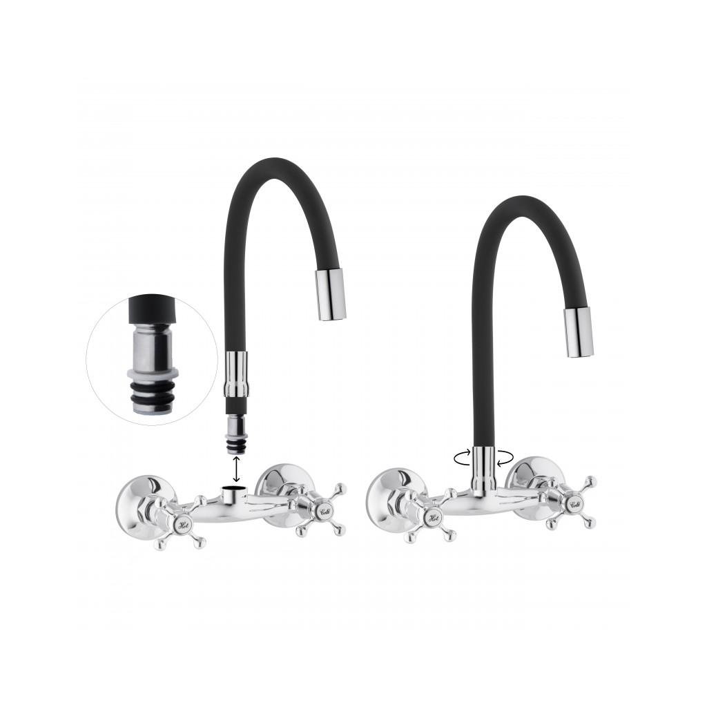 Baterie mecanică pentru chiuvetă/lavoar, montată pe perete, cu două manete. Are o duză neagră lungă, flexibilă, cu memorie de formă, care vă permite nu numai să clătiți rapid vasele sau să spălați chiuveta, ci și să umpleți convenabil vasele cu apă. Bateria are un aerator care aerează și înmoaie perfect fluxul de apă. Această soluție afectează semnificativ consumul de apă, ceea ce înseamnă facturi mai mici ale gospodăriei.