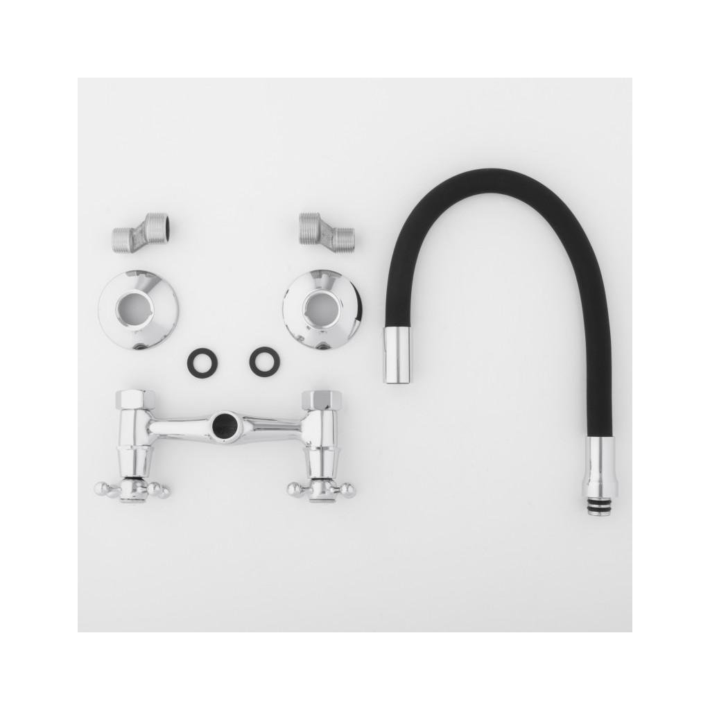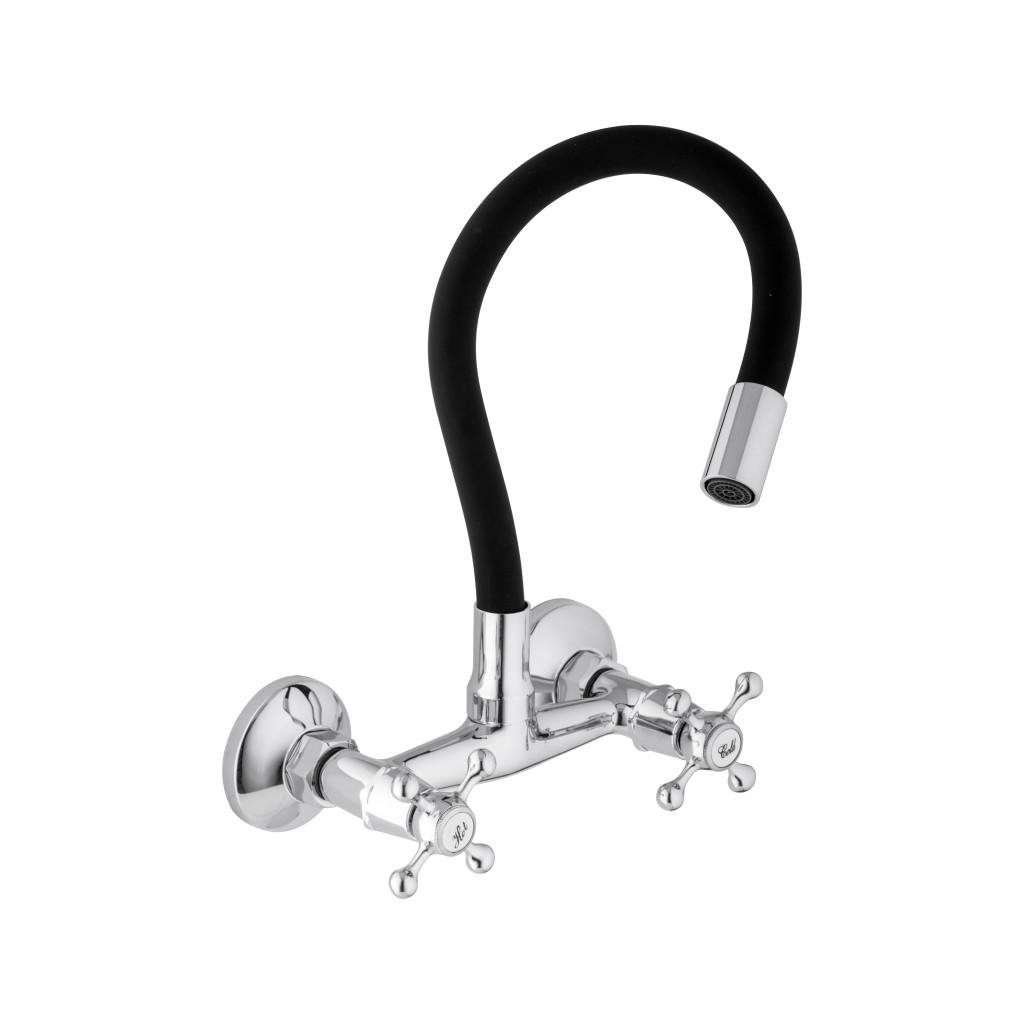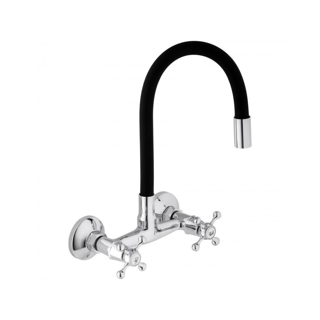 Baterie mecanică pentru chiuvetă/lavoar, montată pe perete, cu două manete. Are o duză neagră lungă, flexibilă, cu memorie de formă, care vă permite nu numai să clătiți rapid vasele sau să spălați chiuveta, ci și să umpleți convenabil vasele cu apă. Bateria are un aerator care aerează și înmoaie perfect fluxul de apă. Această soluție afectează semnificativ consumul de apă, ceea ce înseamnă facturi mai mici ale gospodăriei.