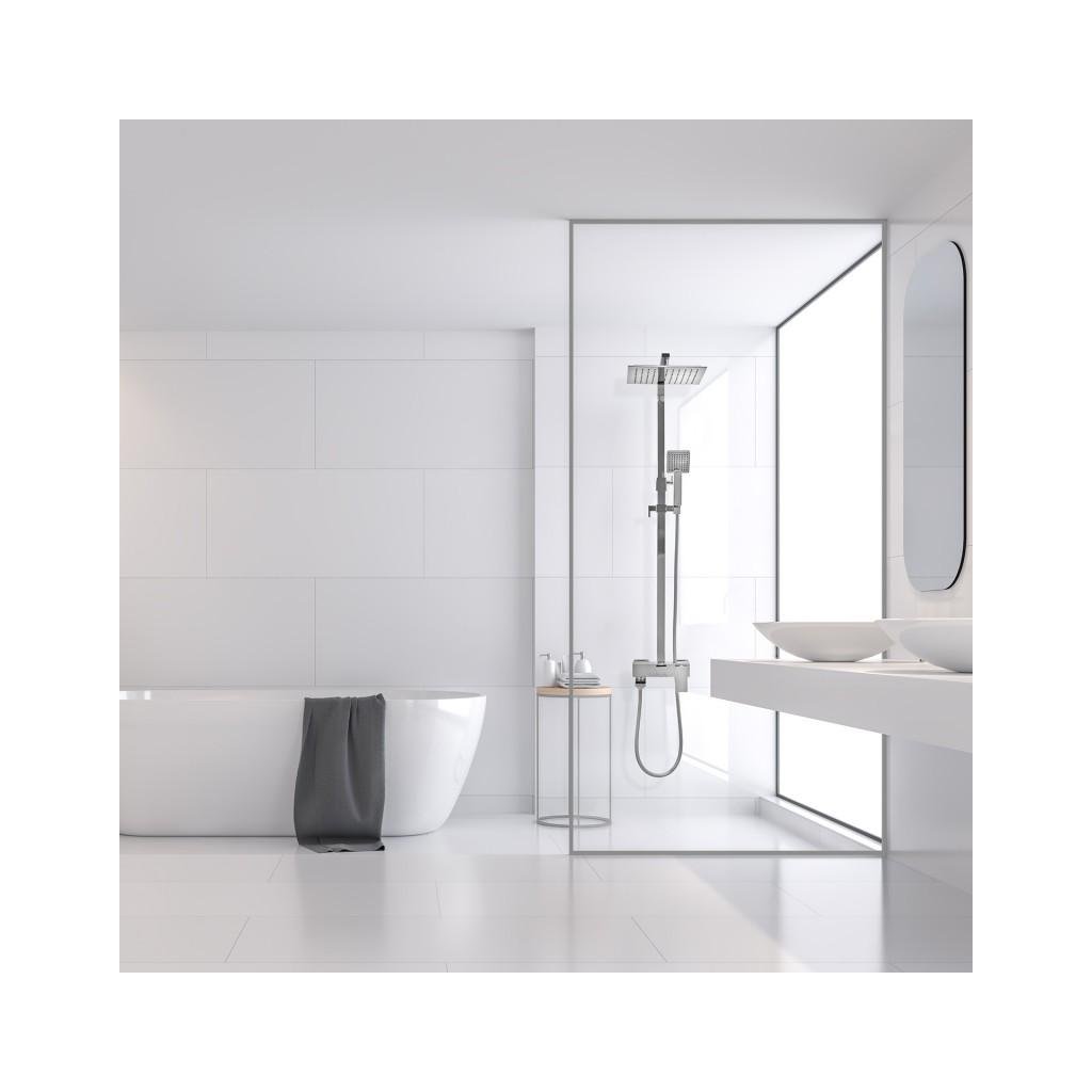 Set de duș cu robinet mecanic, element de control și comutator de debit de apă între dușul cu efect de ploaie, capul de duș manual și dușul de cadă. Setul include un duș cu efect de ploaie larg, elegant, cu dimensiunile de 25 x 25 cm și un cap de duș cu sistem modern ANTI-CALC care previne depunerile de calcar.