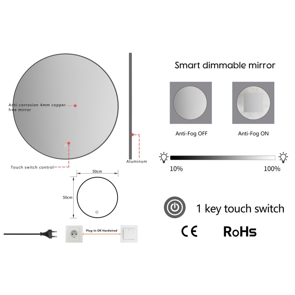 - Această oglindă LED este reglabilă, controlată printr-un comutator cu senzor tactil. Pur și simplu apăsați butonul de pornire timp de 2-3 secunde pentru a regla luminozitatea de la 10% la 100%. Setările de luminozitate sunt salvate automat, deci nu trebuie să reglați luminozitatea de fiecare dată.