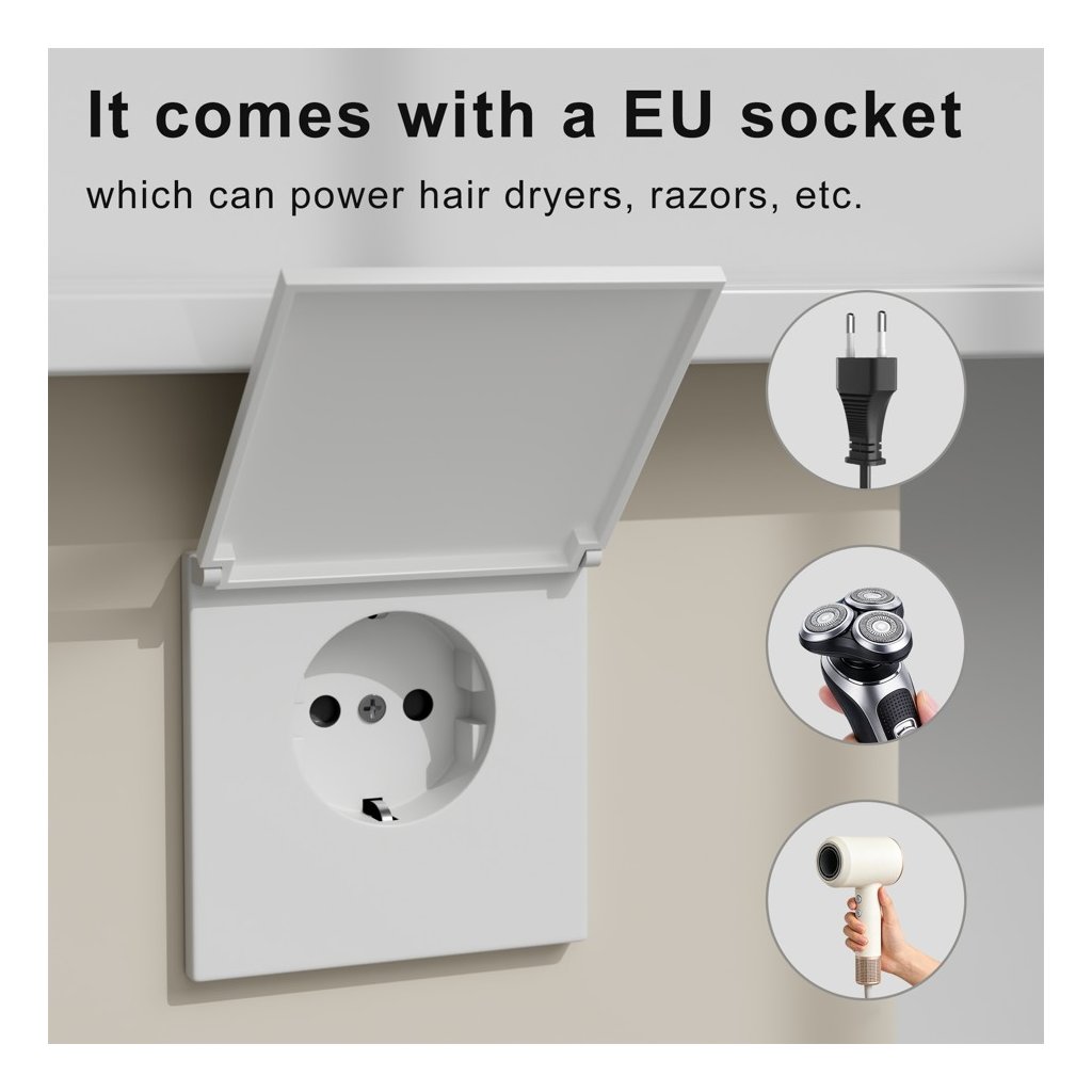 - Priză inclusă în dulap: Da (230 V) - Atenție: priza din interiorul dulapului este destinată uscătoarelor de păr, aparatelor de ras sau periuțelor de dinți. Încărcarea generează căldură, așadar acționați încărcarea cu ușa deschisă.
