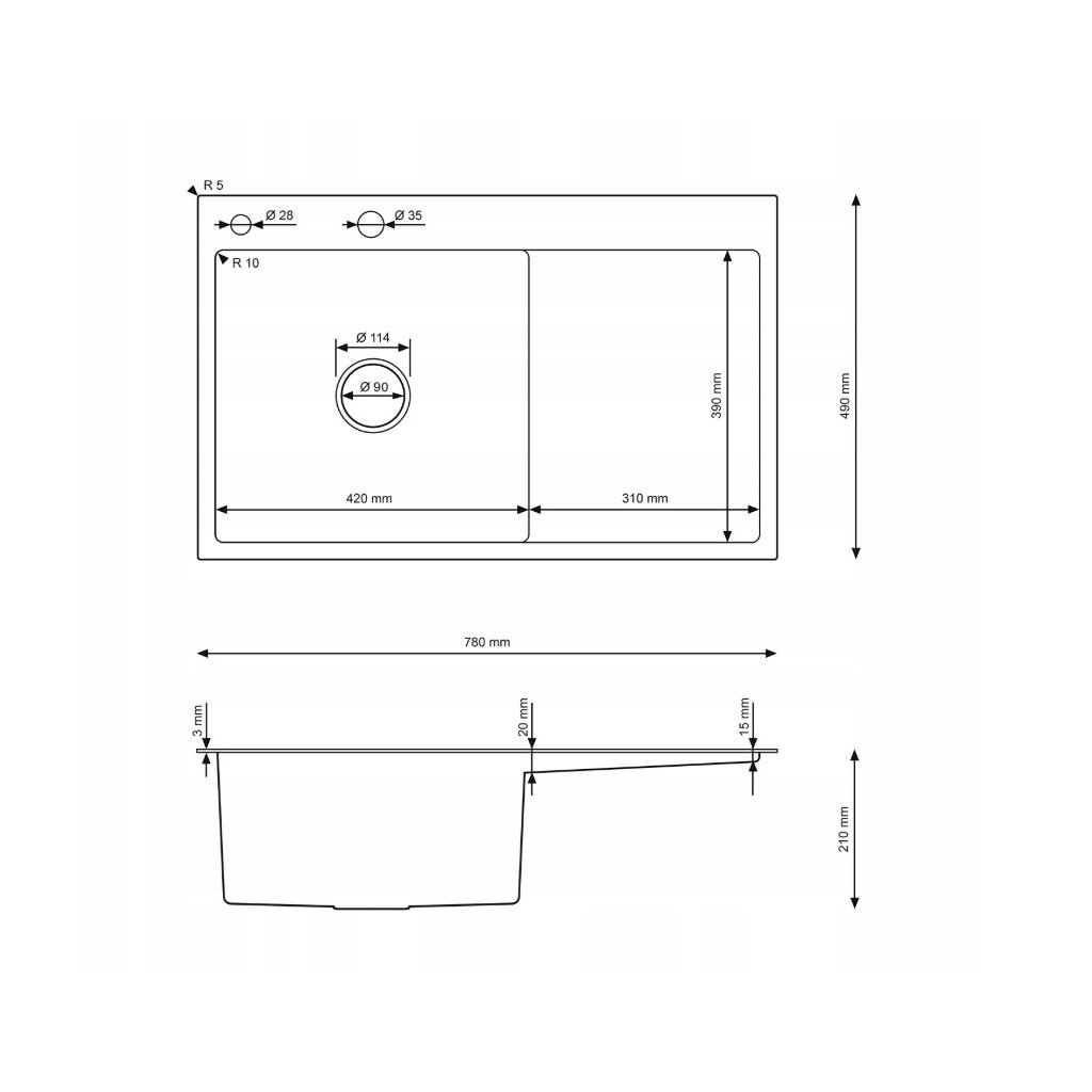 - Dimensiuni chiuveta bucatarie: 780 mm x 490 mm x 210 mm
