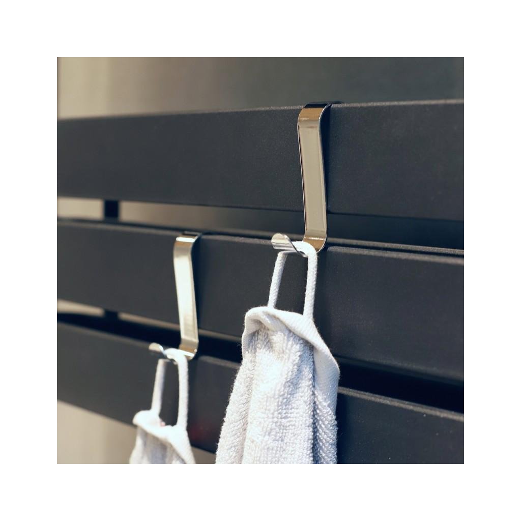 Umerașe practice pentru radiatorul prosoape. Set de doua carlige agatate pe caloriferul de baie din otel vopsit cromat. Este un dispozitiv funcțional într-o baie modernă.