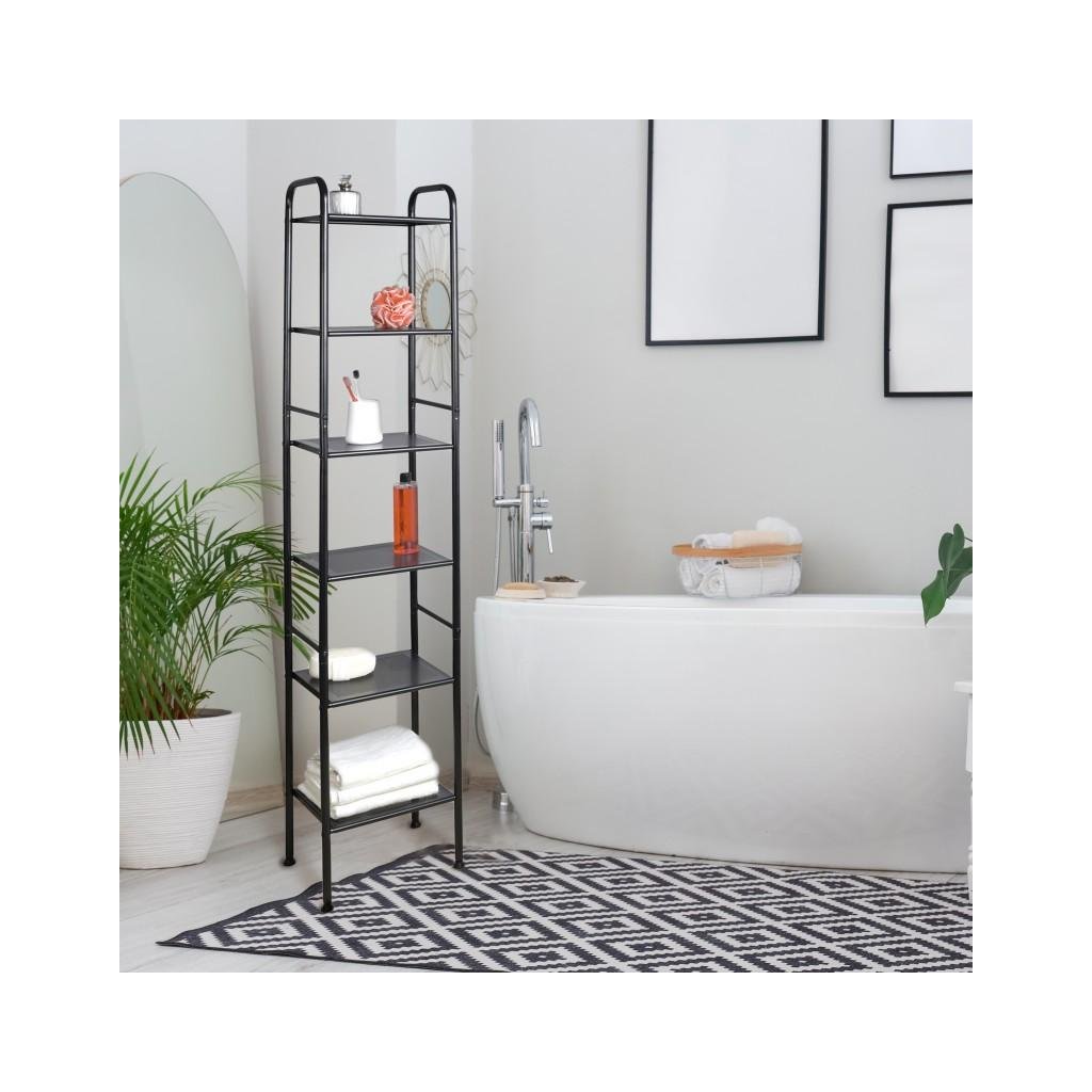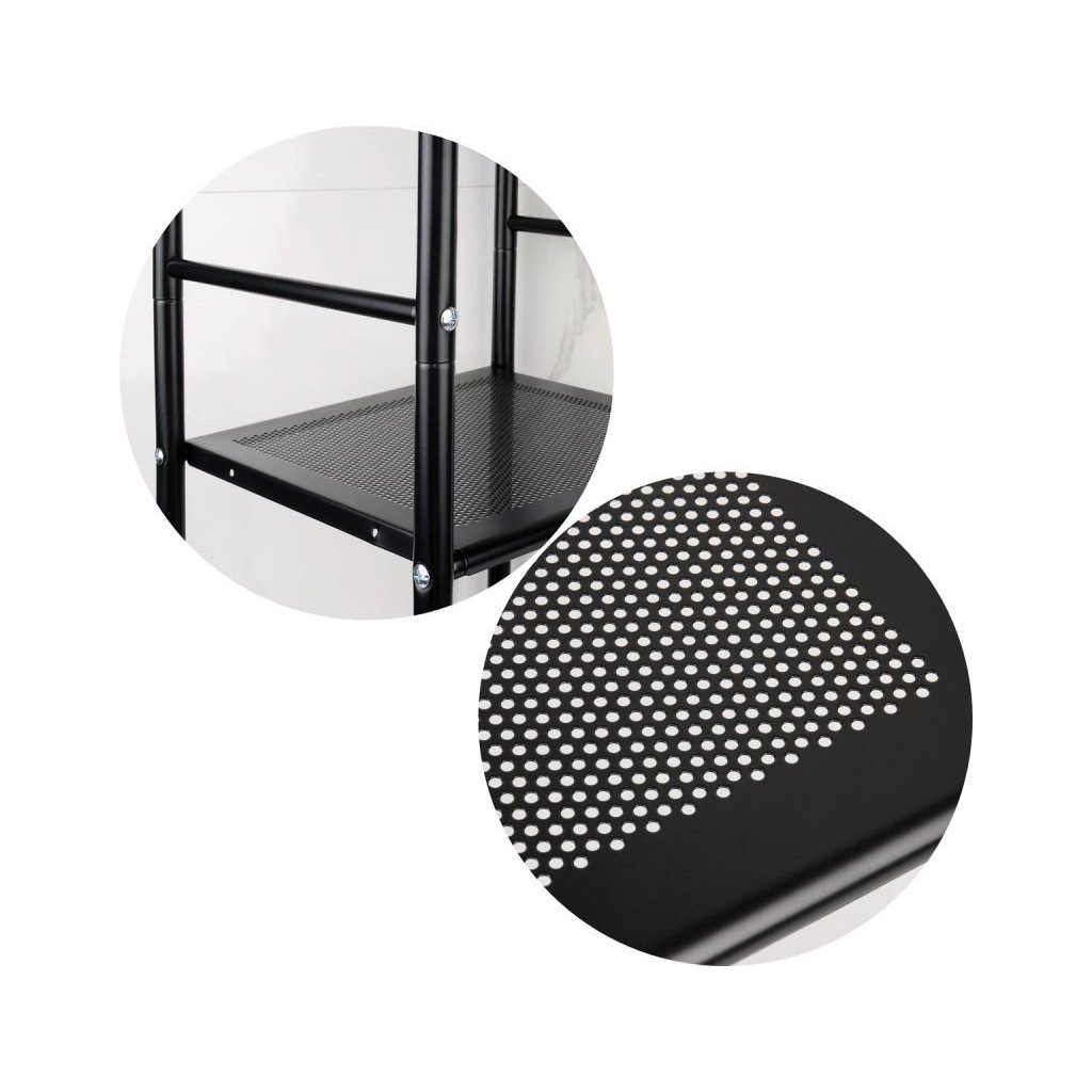 Raft de baie de sine stătător din oțel vopsit de înaltă calitate. Are până la șase rafturi spațioase distanțate uniform și acoperite cu găuri mici. Biblioteca se sprijină pe patru picioare reglabile liber. Suprafața bibliotecii este netedă, de culoare neagră mat - se potrivește în orice cameră. Il recomandam pentru bai private, saloane SPA, saloane de coafura si infrumusetare, precum si birouri si bucatarii.
