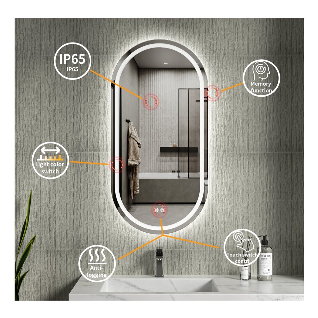 Control tactil inteligent | Nu trebuie să pierzi timpul ajustând luminozitatea luminii de fundal atunci când oprești și pornești în mod repetat oglinda. Oglinda va memora setările anterioare. Oglinzile sunt echipate cu un senzor tactil. Iluminatul poate fi aprins și stins cu un întrerupător standard. | |