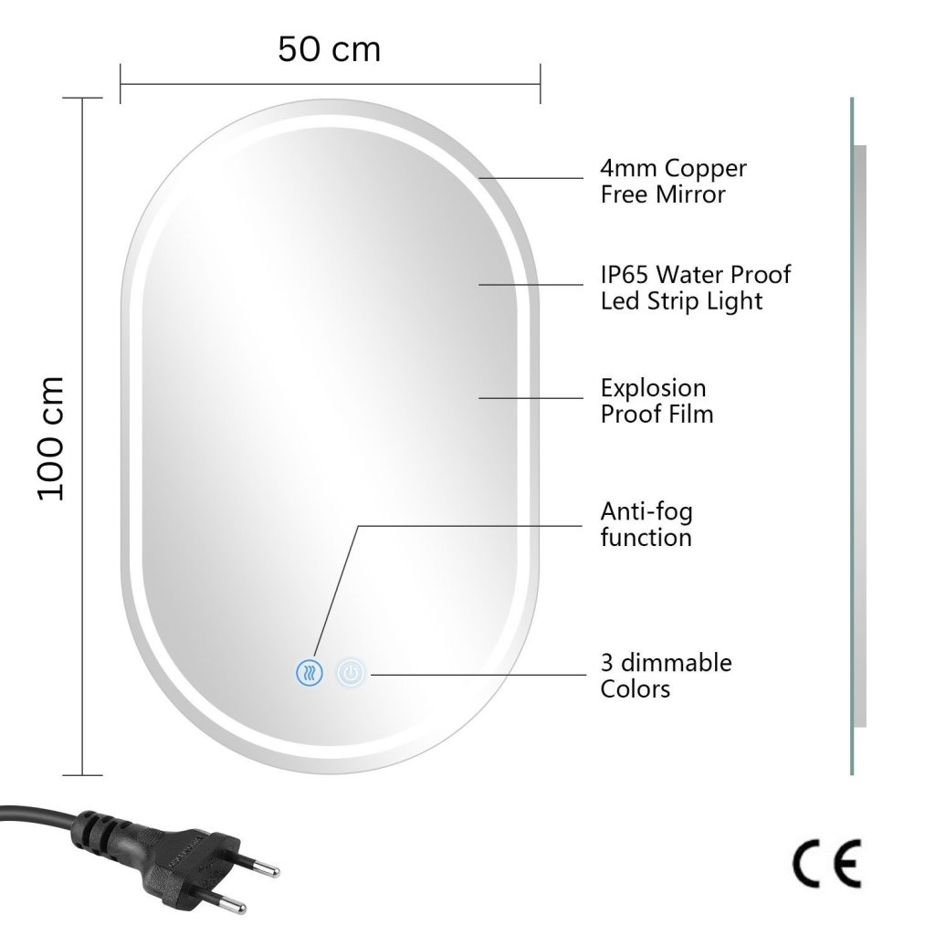 Culoare lumină reglabilă | Oglinda LED are 3 setări de culoare. Culoare lumină caldă (3000K) / Neutră (4000K) / Rece (6000K) | |