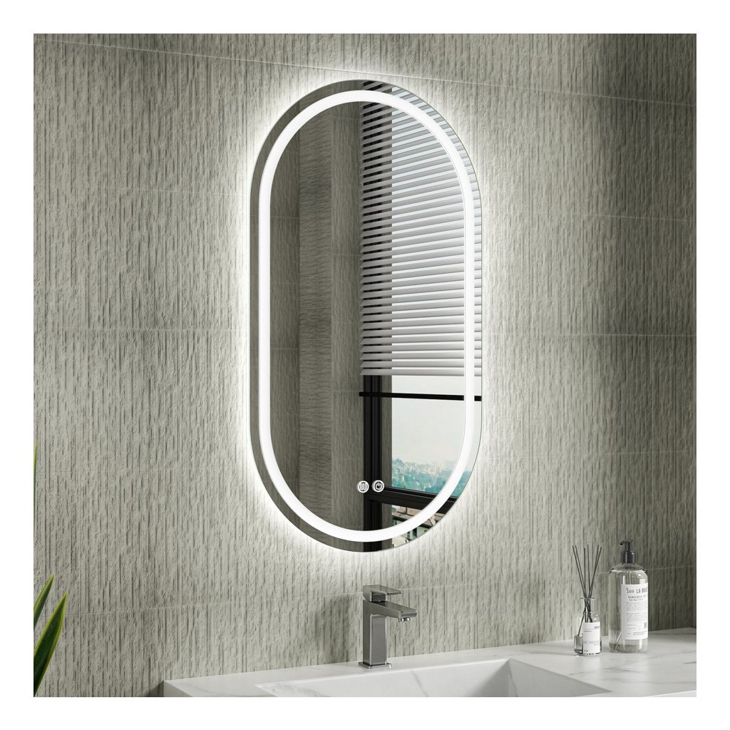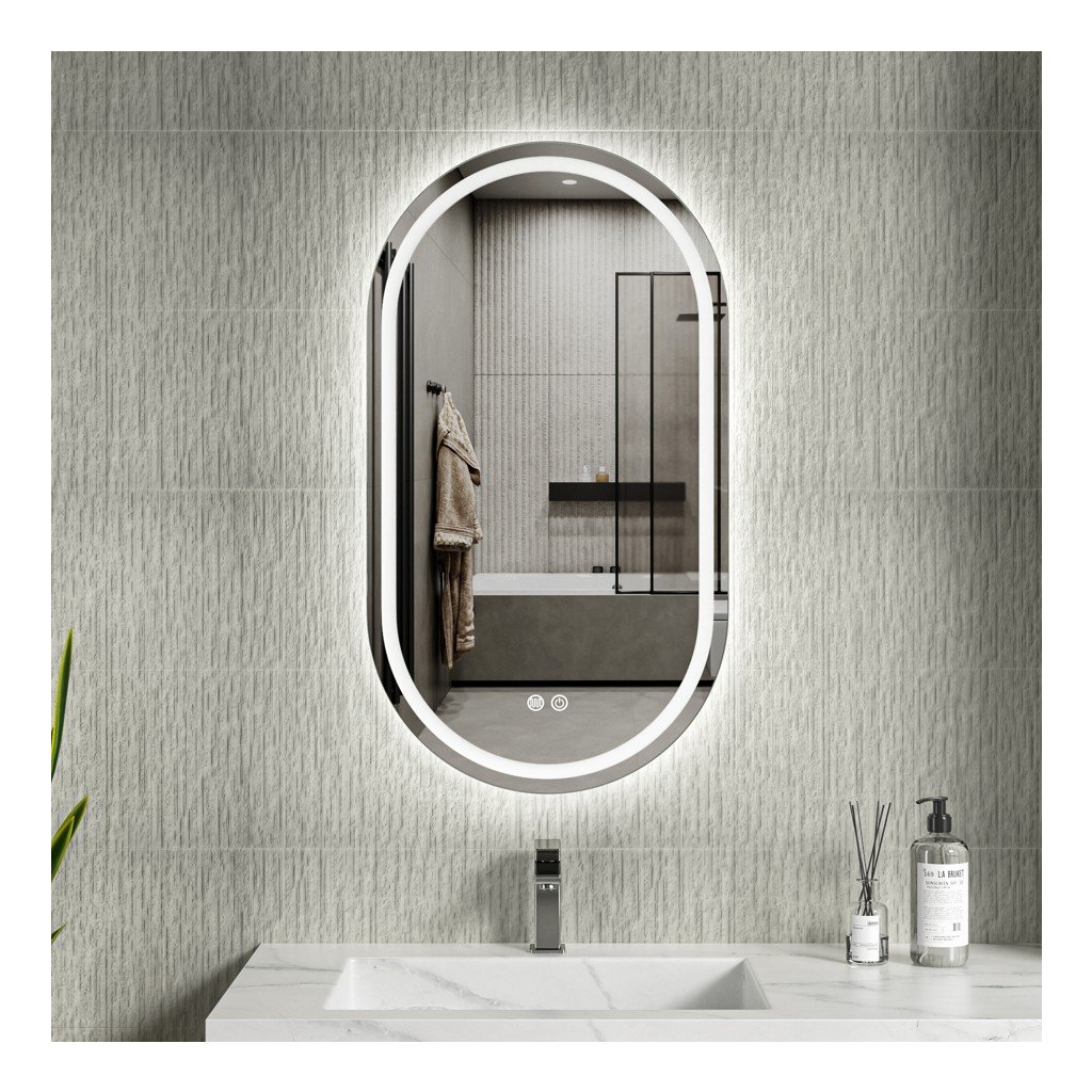 Erga Lyra, oglindă ovală LED 50x90cm, 3 culori de lumină, iluminare față și spate, pernă încălzitoare anti-aburire, ERG-V01-LYRA-5090-CL