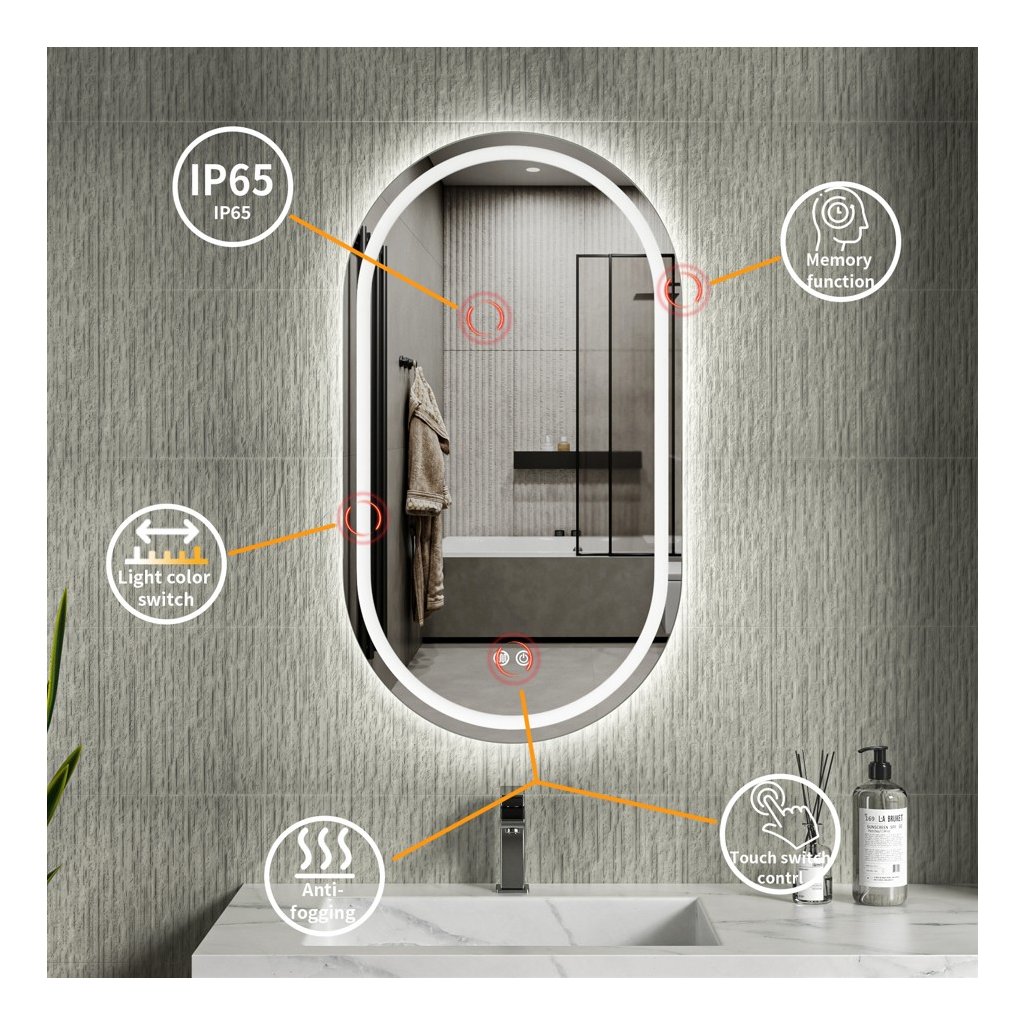 Control tactil inteligent | Nu trebuie să pierzi timpul ajustând luminozitatea luminii de fundal atunci când oprești și pornești în mod repetat oglinda. Oglinda va memora setările anterioare. Oglinzile sunt echipate cu un senzor tactil. Iluminatul poate fi aprins și stins cu un întrerupător standard. | |