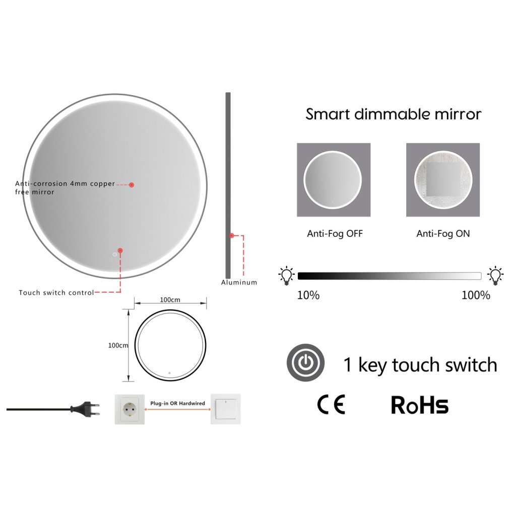 - Această oglindă LED este reglabilă, controlată printr-un comutator cu senzor tactil. Pur și simplu apăsați butonul de pornire timp de 2-3 secunde pentru a regla luminozitatea de la 10% la 100%. Setările de luminozitate sunt salvate automat, deci nu trebuie să reglați luminozitatea de fiecare dată.