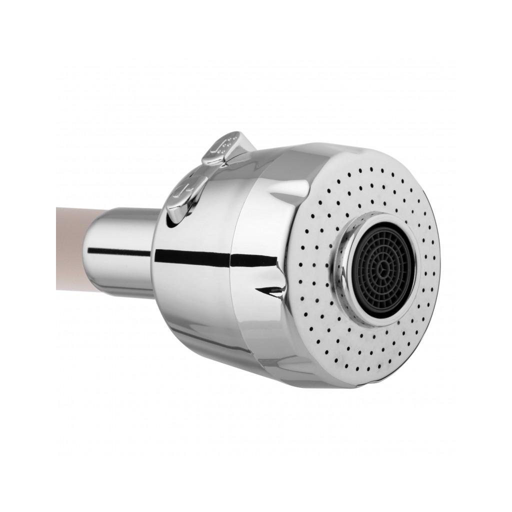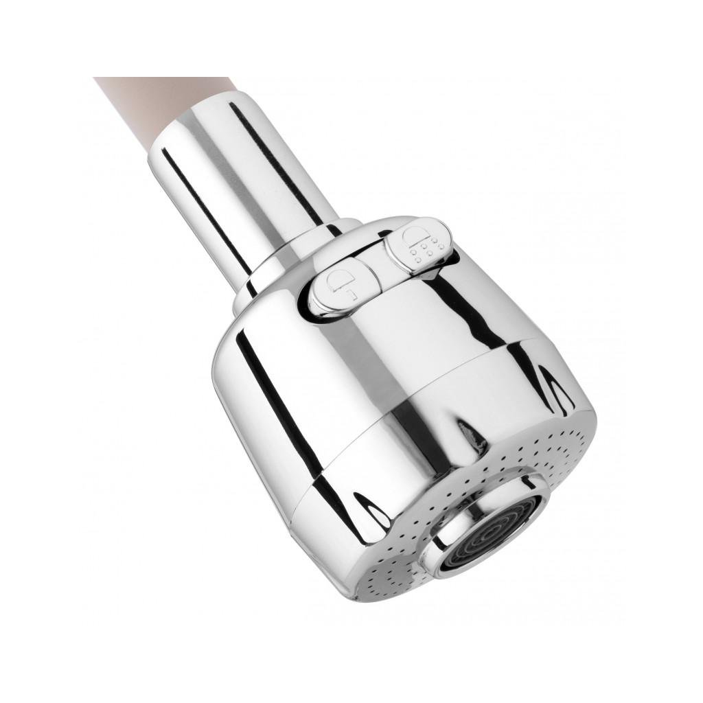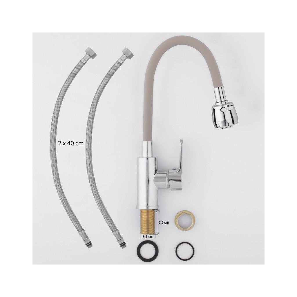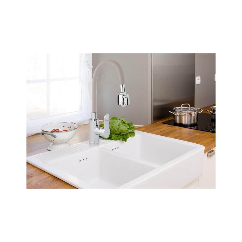 Robinet de la chiuveta stand. Are o duză de memorie lungă, flexibilă, din silicon de culoare bej. Bateria este echipată cu un gura cu dublă funcție, datorită căruia putem schimba jetul de apă din clasic în dispersat. Duza flexibilă, pe de altă parte, ne oferă posibilitatea nu numai să clătim rapid vasele sau să spălăm chiuveta, ci și să umplem convenabil vasele cu apă. Aeratorul reduce consumul de apă cu până la 40%. Setul contine toate elementele necesare asamblarii.