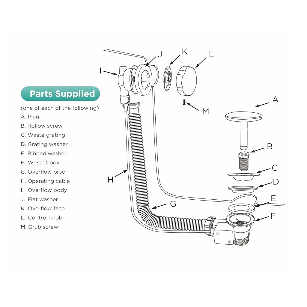 - Tip: sifon automat pentru cadă cu preaplin / control al scurgerii prin cablu Bowden