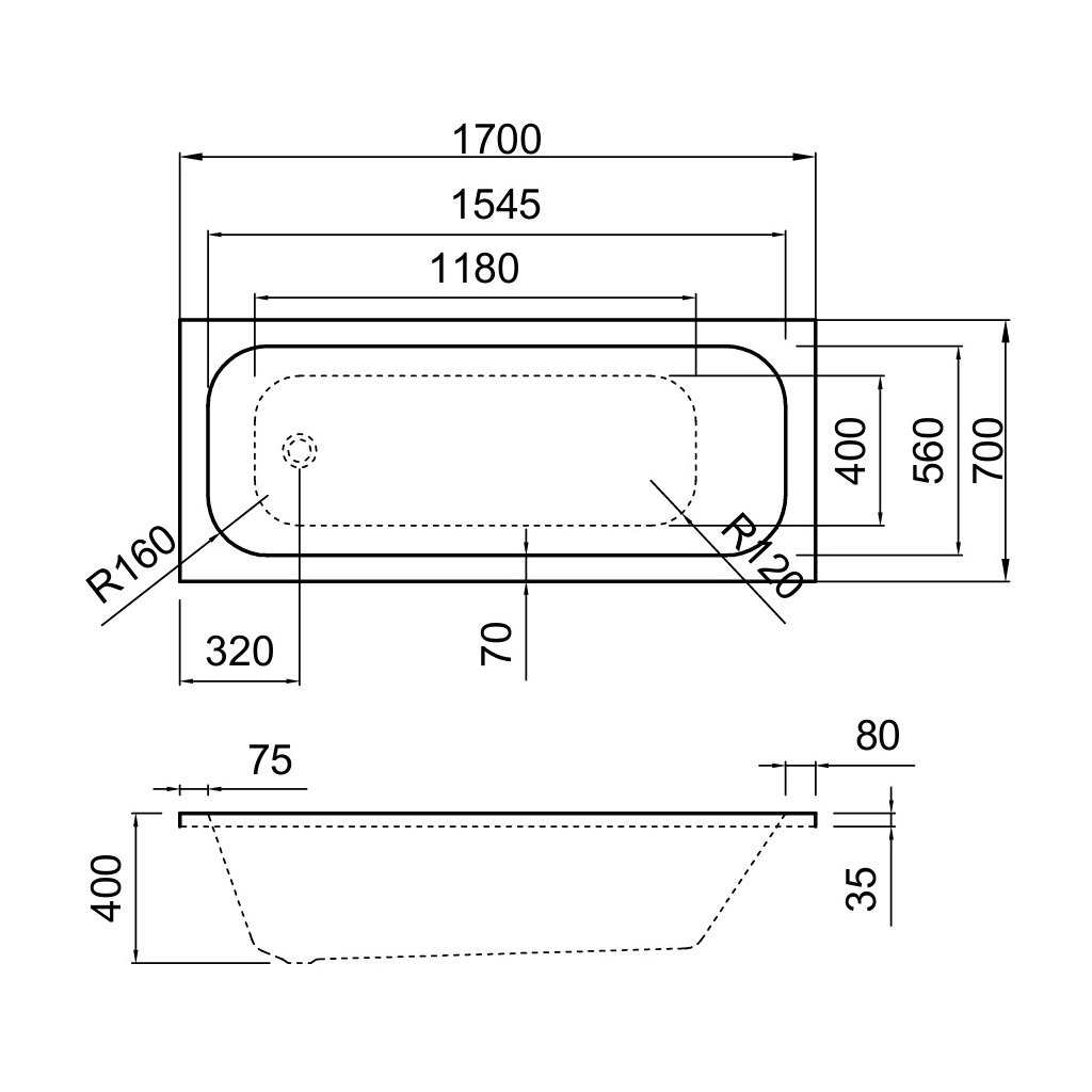 Erga Pureline-O, cadă de baie 1700x700x400 mm fără picioare, alb lucios, ERG-V07-PURELINE-O-170x070-WH