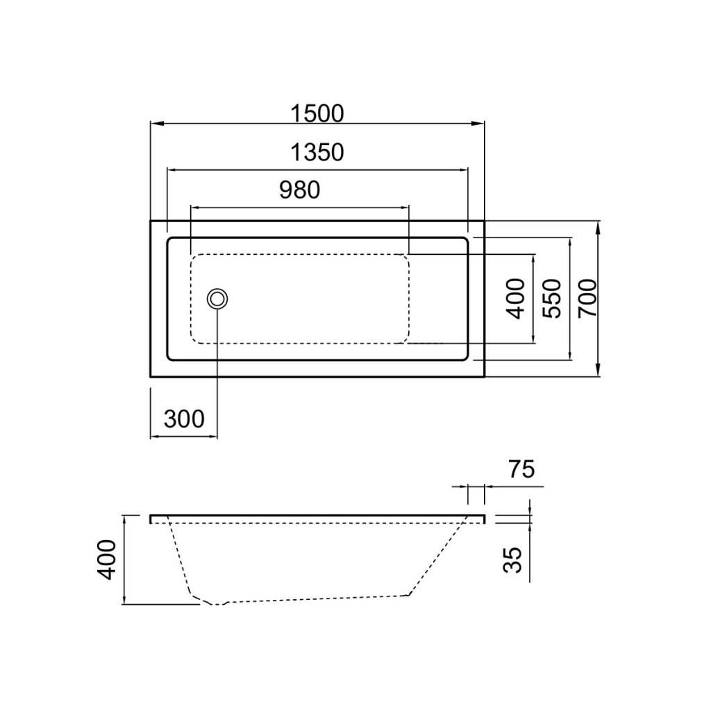 Erga Pureline-S, cadă de baie 1500x700x400 mm fără picioare, alb lucios, ERG-V07-PURELINE-S-150x070-WH