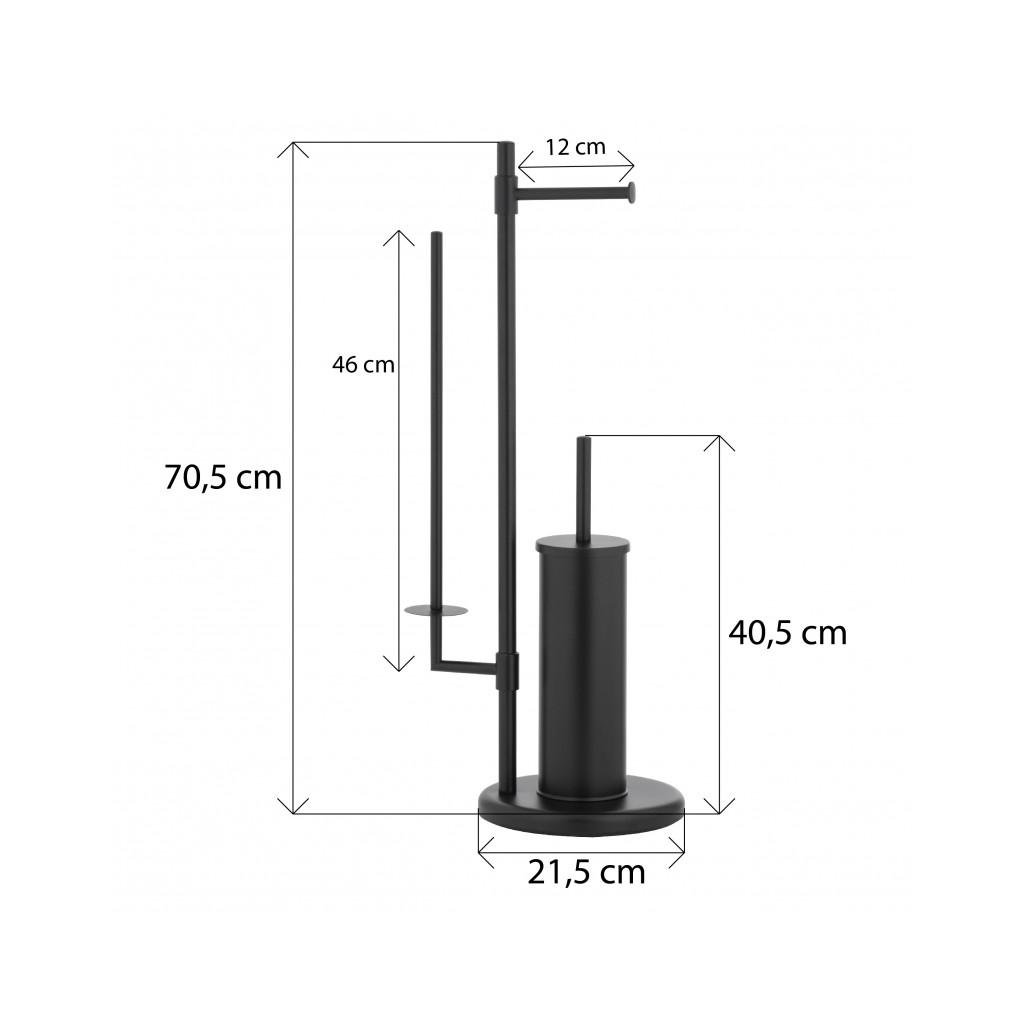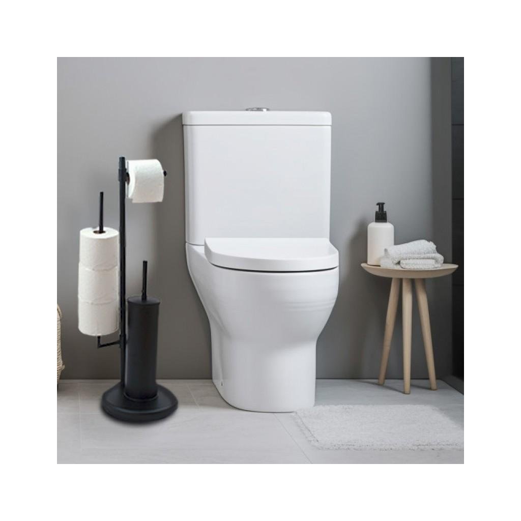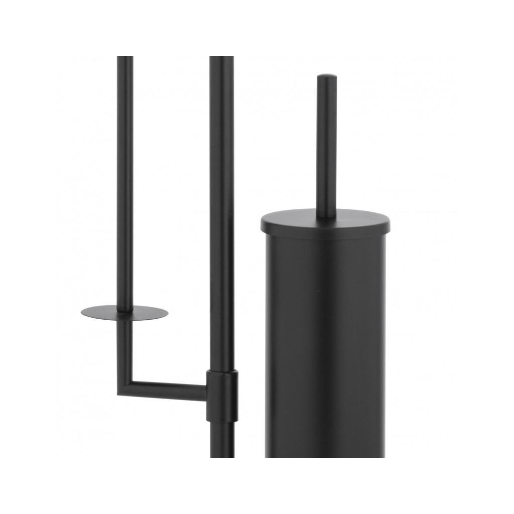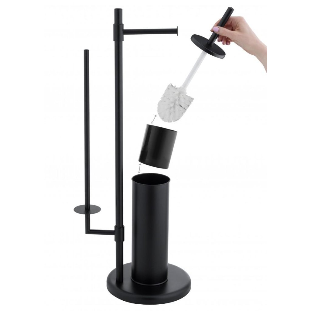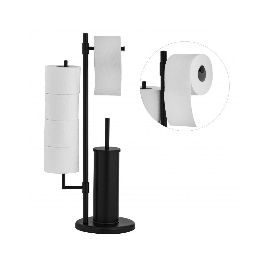Suport elegant pentru hârtie igienică de rezervă cu perie de toaletă suplimentară și suport pentru role. Suportul este realizat din oțel negru acoperit cu pulbere de înaltă calitate. Baza largă și plăcuțele din plastic asigură o stabilitate excelentă.