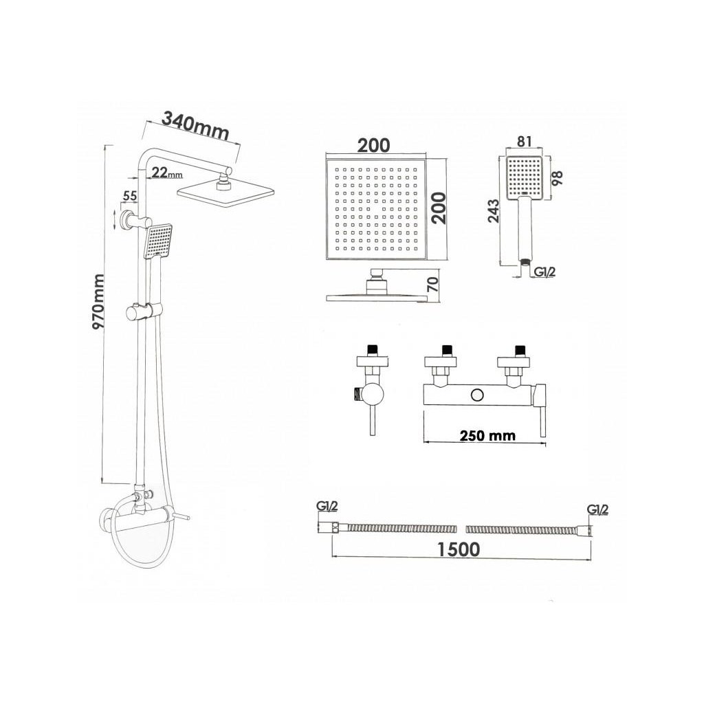 - Tip kit: montat pe perete, cu două orificii, cu o gaură, cu întrerupător, cu apă de ploaie 20 x 20 cm și receptor de duș