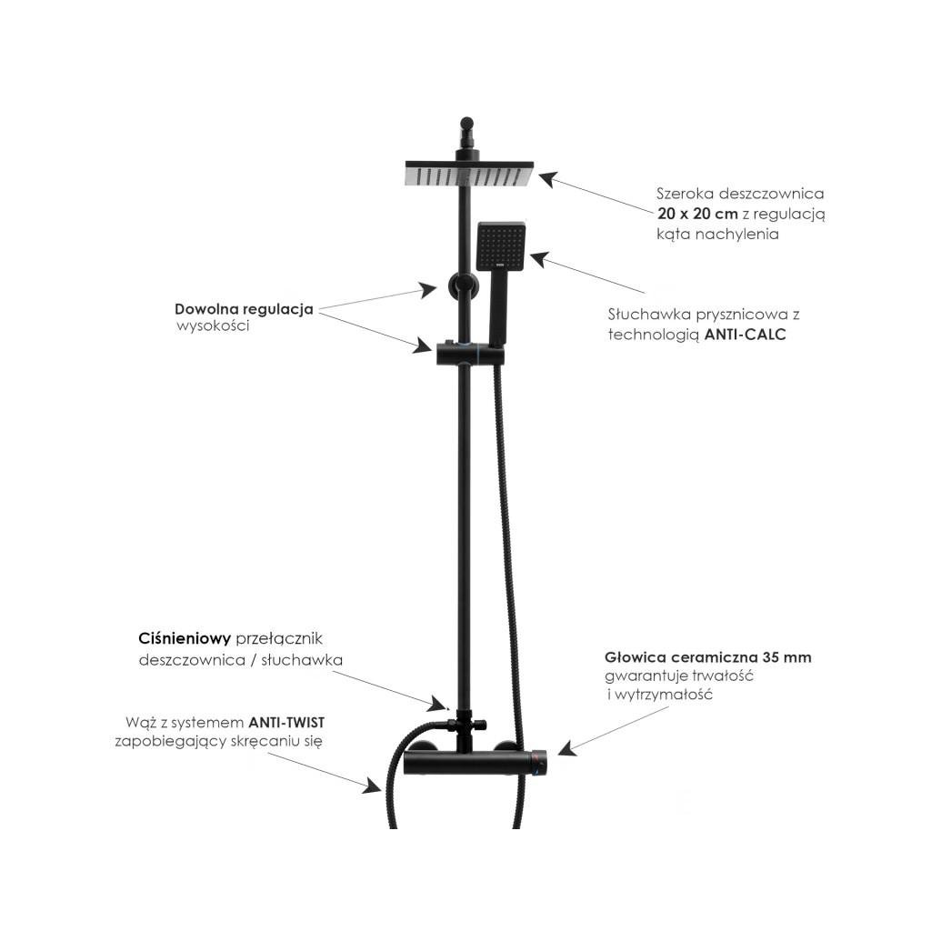 Pachetul include un robinet de dus mecanic cu reglare debit si mixer de temperatura si un presostat pentru debitul de apa intre dusul cu efect de ploaie si capul de dus manual. Setul include o apa de ploaie stilata de 20 x 20 cm tip SLIM si un cap de dus de mana de culoare neagra mat - ambele elemente cu sistemul modern ANTI-CALC. Designul setului a fost subordonat ultimelor tendințe - arată foarte elegant și se potrivește perfect într-o baie modernă.