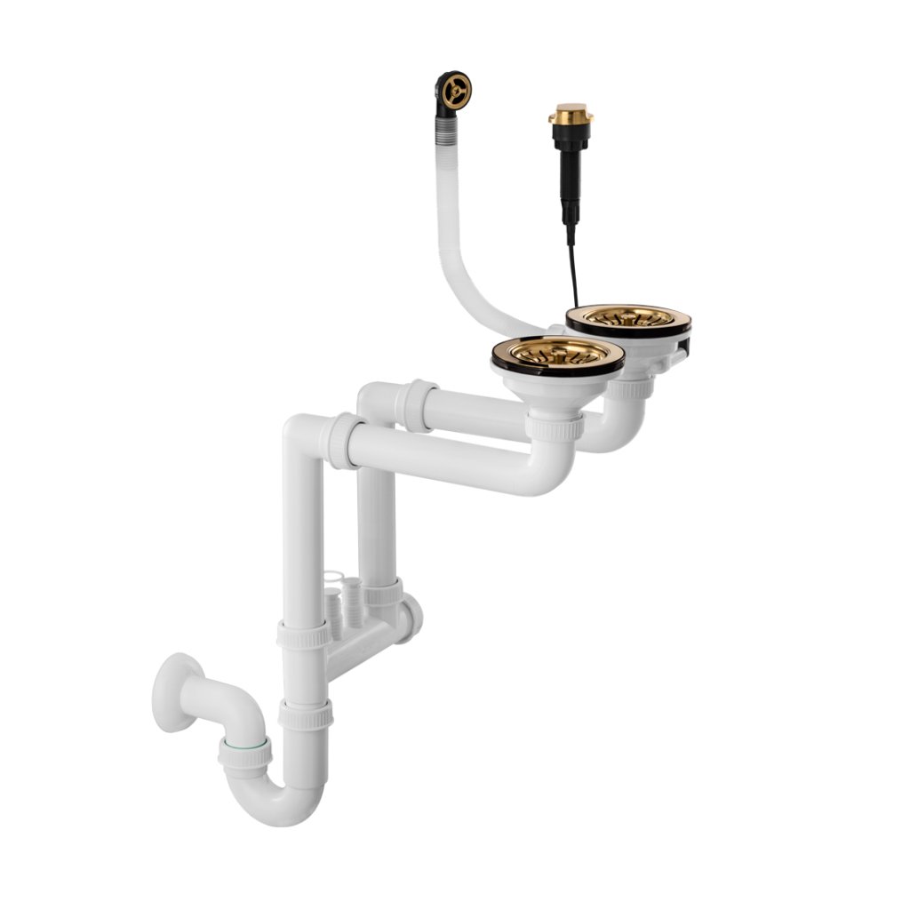 Gamma, sifon automat cu 2 camere pentru chiuvete din granit cu preaplin rotund, auriu lucios, GMA-1A22GD